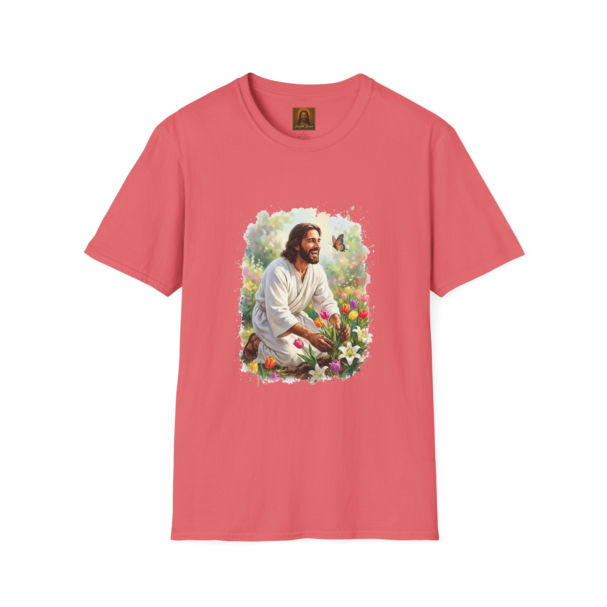 Jesus in the Garden Shirt, Easter Lily Butterfly Art, Christian Spring Tee