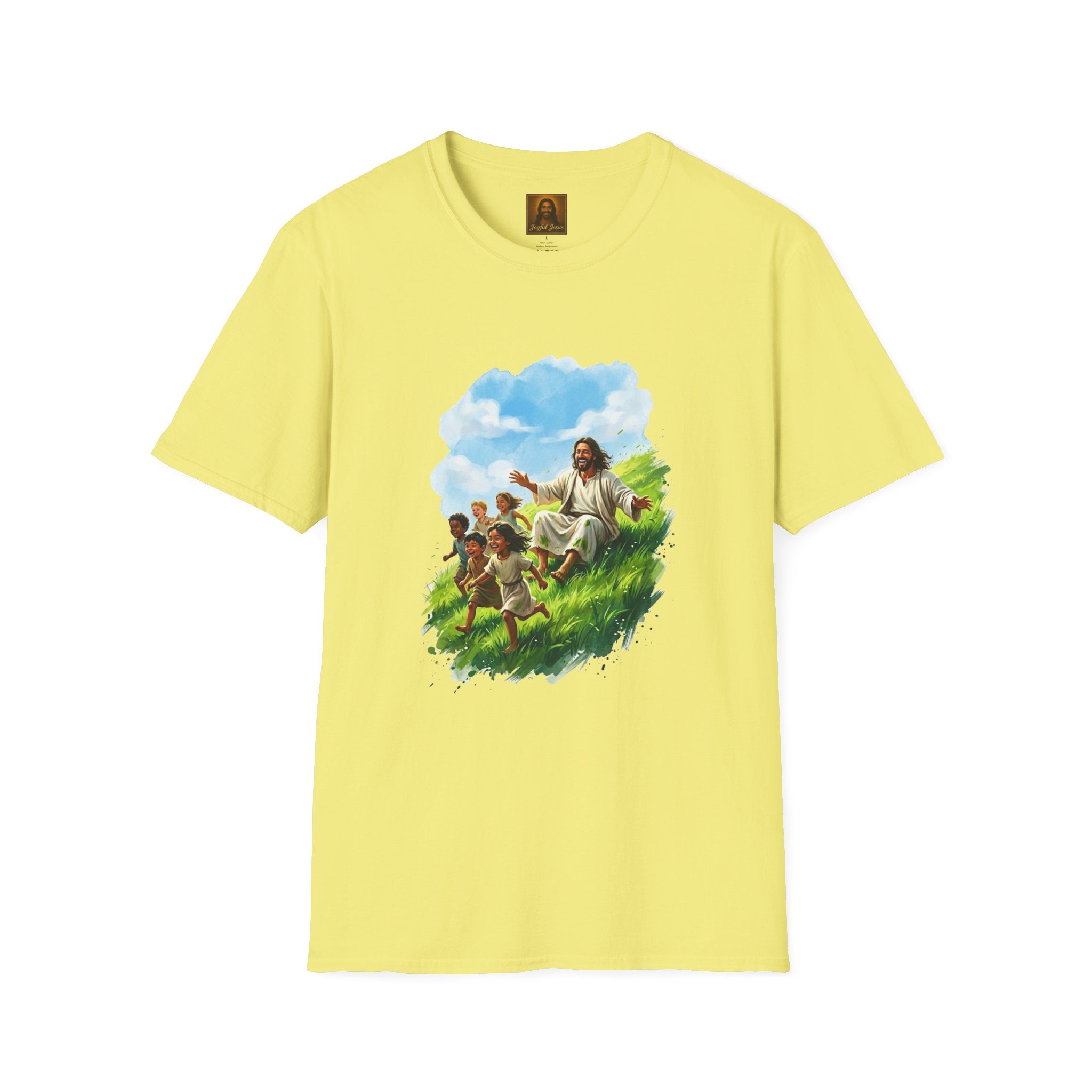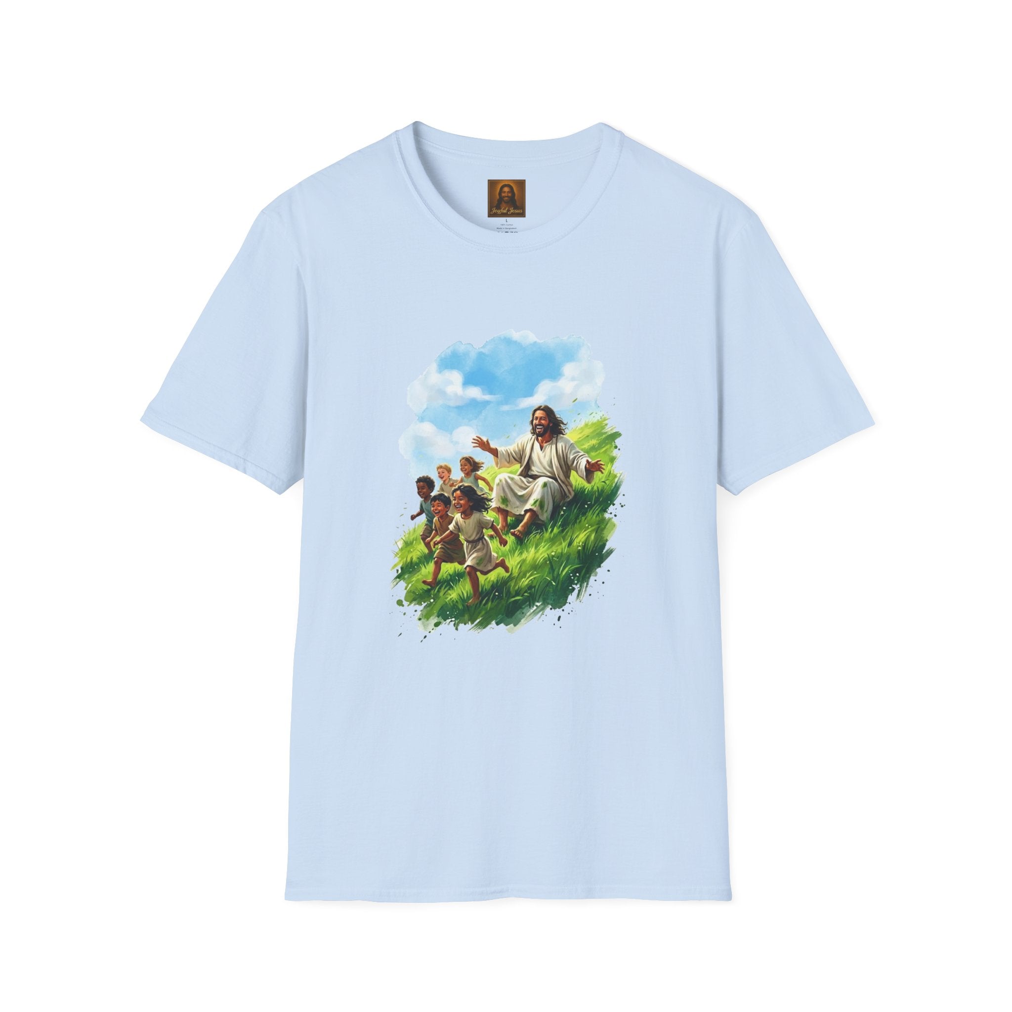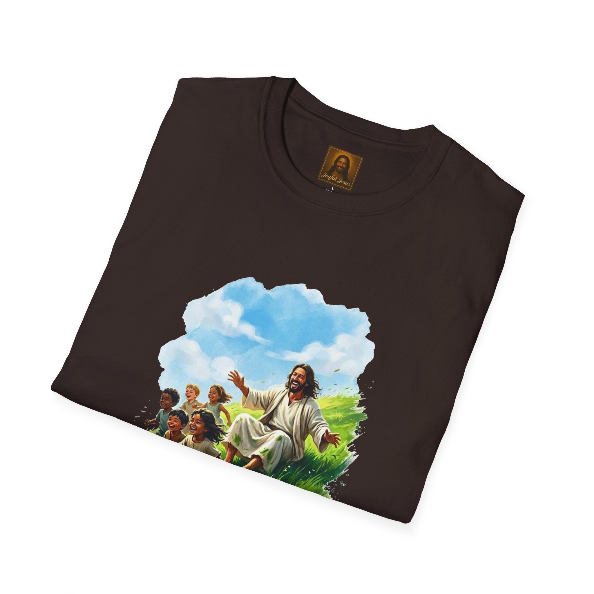 The Easter Egg Roll — Jesus sliding down a grassy hill with kids, laughing, grass-stained, and fully in the fun. Wearable art from Joyful Jesus. Joy is the Way. "Let the little children come to me, and do not hinder them, for the kingdom of heaven belongs to such as these." — Matthew 19:14 He meant it. Grass stains and all. This original Joyful Jesus design brings one of the most beloved scriptures to life — not in a stained glass window, but on a grassy hillside where Jesus is tumbling downhill with a group of kids, every single one of them laughing their heads off. Robes covered in grass stains, arms wide open, pure unbridled joy. ABOUT THE DESIGN A vibrant, painterly scene of Jesus and a diverse group of children rolling and running down a lush green hill under bright blue skies. The energy is contagious — kids sprinting, hair flying, everyone laughing. Jesus is right in the middle of it with grass-stained robes and the biggest smile in the bunch. Brushstroke-edge framing on a black background. ABOUT JOYFUL JESUS We believe joy is the heart of Jesus' message. Every design celebrates faith through vibrant, art-forward imagery — never preachy, never political, just joy. Joy is the Way. PERFECT FOR - Easter celebrations and spring gatherings - Parents and grandparents who love Jesus and kids - Sunday school teachers, youth pastors, and children's ministry leaders - Family matching Easter shirts - Church Easter egg roll events and spring picnics - Anyone who believes the kingdom belongs to children PRODUCT DETAILS - Premium unisex t-shirt - Print-on-demand (made just for you) - Multiple sizes available (see size chart) - Machine wash cold, tumble dry low - Printed with high-quality, durable inks SHIPPING Free shipping included! Orders are produced and shipped within 2-7 business days. ORDER EARLY FOR EASTER Easter is April 5, 2026. Order by mid-March to ensure delivery in time! Have questions? Message us anytime — we respond quickly! Product features - 100% ring-spun cotton (lightweight 153 g/m²) for a soft, breathable feel - Tubular knit without side seams for a smooth, waste-reducing finish - Ribbed collar with shoulder tape to retain shape and prevent stretching - Pearlized tear-away label for itch-free comfort and DTF/DTG printed artwork - Oeko-Tex certified and ethically sourced cotton with 2-year EU warranty Care instructions - Do not dryclean - Do not bleach - Tumble dry: low heat - Iron, steam or dry: low heat - Machine wash: cold (max 30C or 90F), with similar colors
