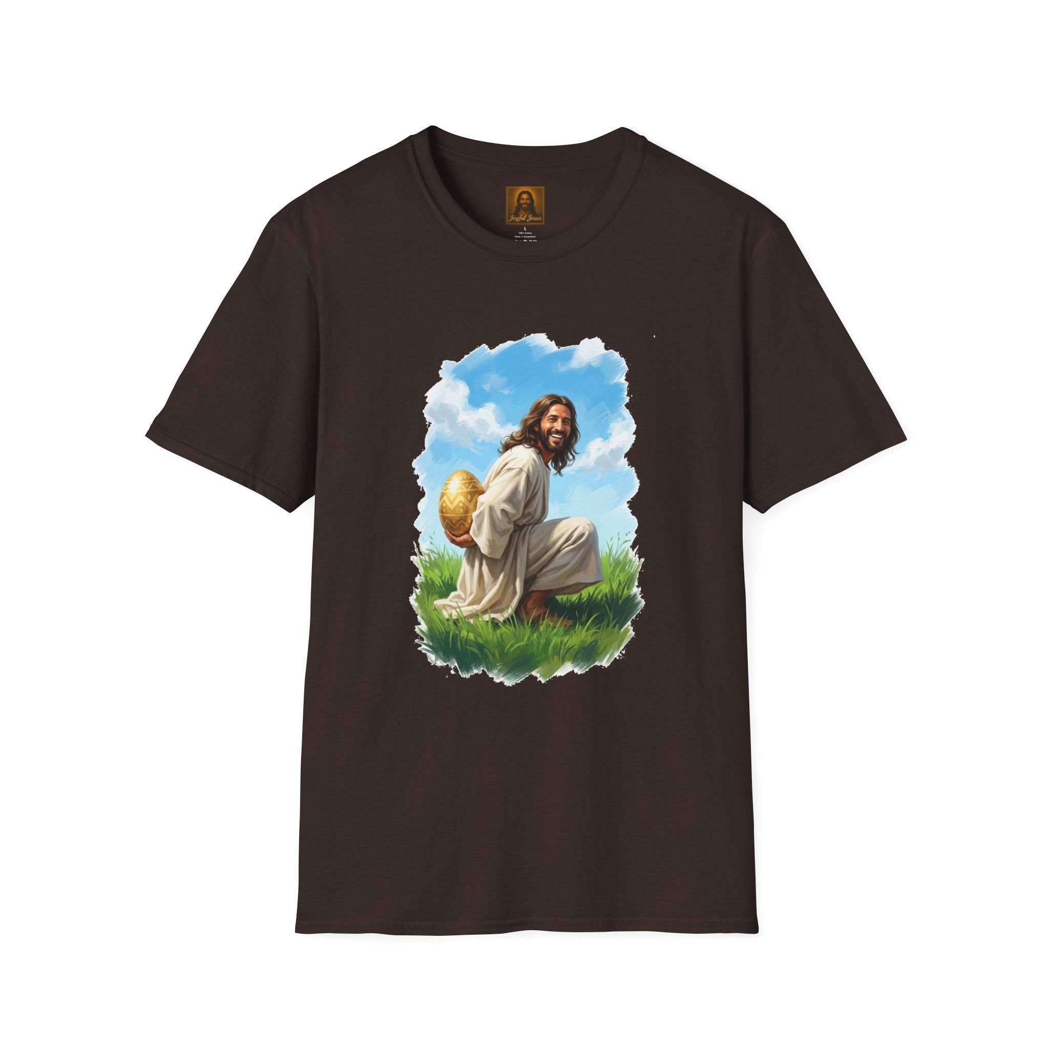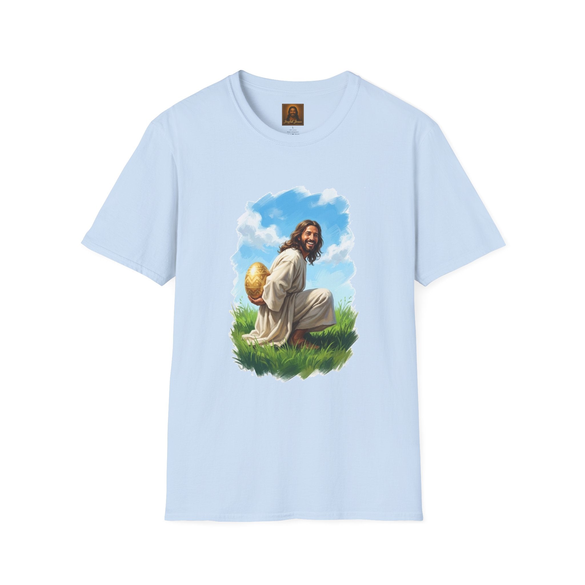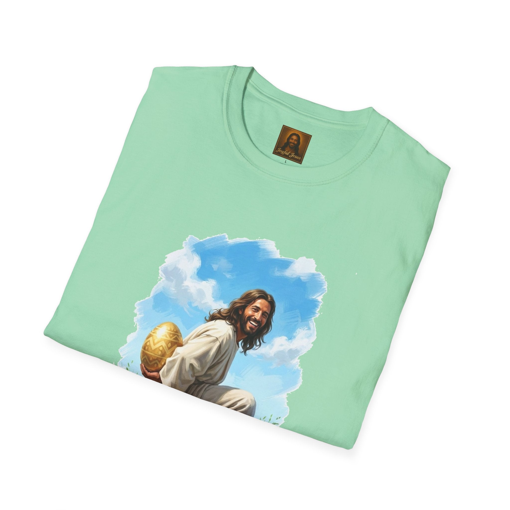 Jesus found the golden egg — and it's filled with the Gospel. Fun, faith-forward Easter art from Joyful Jesus. Joy is the Way. Jesus found the golden egg — and it's filled with the Gospel. This original Joyful Jesus design captures the playful side of Easter. Jesus kneeling in the grass with a mischievous grin, holding a golden decorated egg like he's got the best surprise in the world. Because he does. ABOUT THE DESIGN A warm, painterly scene of Jesus crouching in bright green grass under blue skies, cradling a golden Easter egg with that unmistakable Joyful Jesus smile. It's fun, it's joyful, and it bridges the Easter egg tradition with the real meaning of the holiday in a way that makes people smile. Brushstroke-edge framing on a black background makes the colors pop. ABOUT JOYFUL JESUS We believe joy is the heart of Jesus' message. Every design celebrates faith through vibrant, art-forward imagery — never preachy, never political, just joy. Joy is the Way. PERFECT FOR - Easter egg hunts and Easter Sunday celebrations - Families who want to connect Easter fun with Easter faith - The person who loves a good-natured Christian humor shirt - Easter gifts for friends, parents, and youth group leaders - Church events, potlucks, and spring gatherings PRODUCT DETAILS - Premium unisex t-shirt - Print-on-demand (made just for you) - Multiple sizes available (see size chart) - Machine wash cold, tumble dry low - Printed with high-quality, durable inks SHIPPING Free shipping included! Orders are produced and shipped within 2-7 business days. ORDER EARLY FOR EASTER Easter is April 5, 2026. Order by mid-March to ensure delivery in time! Have questions? Message us anytime — we respond quickly! Product features - 100% ring-spun cotton (lightweight 153 g/m²) for a soft, breathable feel - Tubular knit without side seams for a smooth, waste-reducing finish - Ribbed knit collar with shoulder tape to preserve shape and prevent stretching - Pearlized tear-away label for comfortable wear; DTF/DTG printed artwork for vivid, durable color - Ethically produced; Oeko-Tex certified with EU 2-year warranty and compliance testing Care instructions - Do not dryclean - Do not bleach - Tumble dry: low heat - Iron, steam or dry: low heat - Machine wash: cold (max 30C or 90F), with similar colors