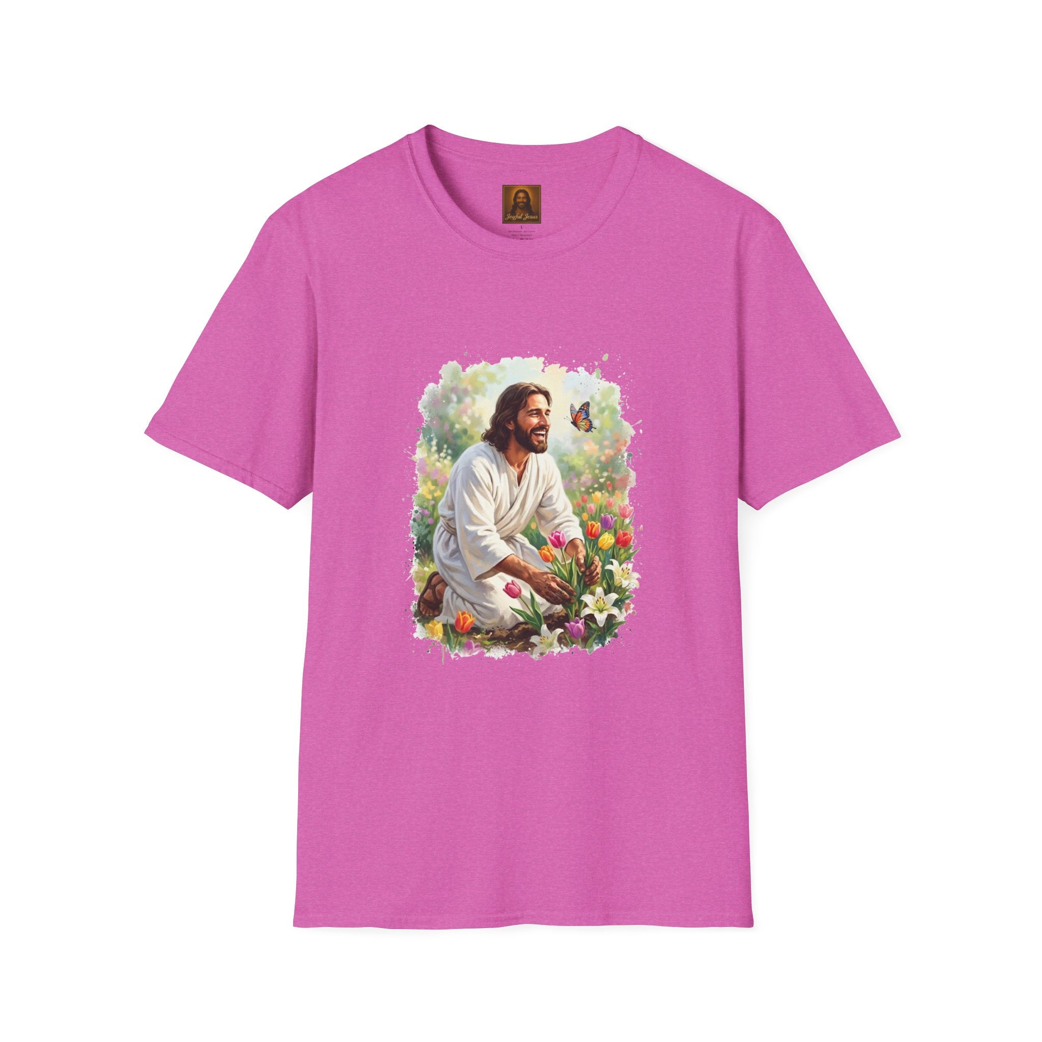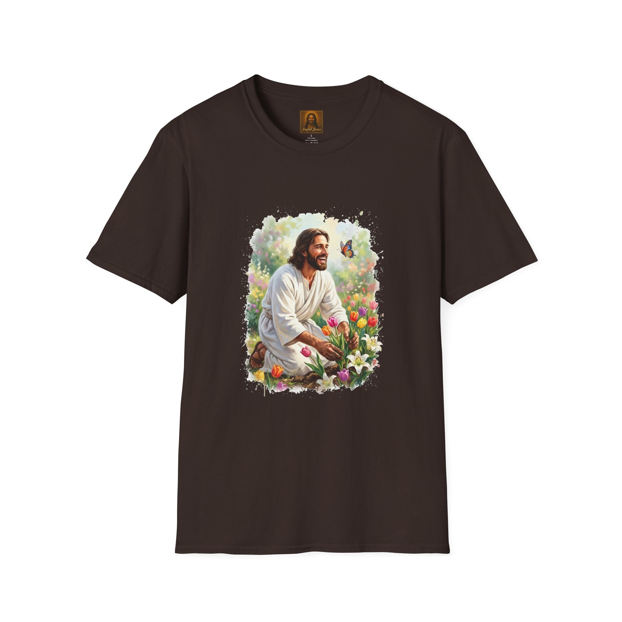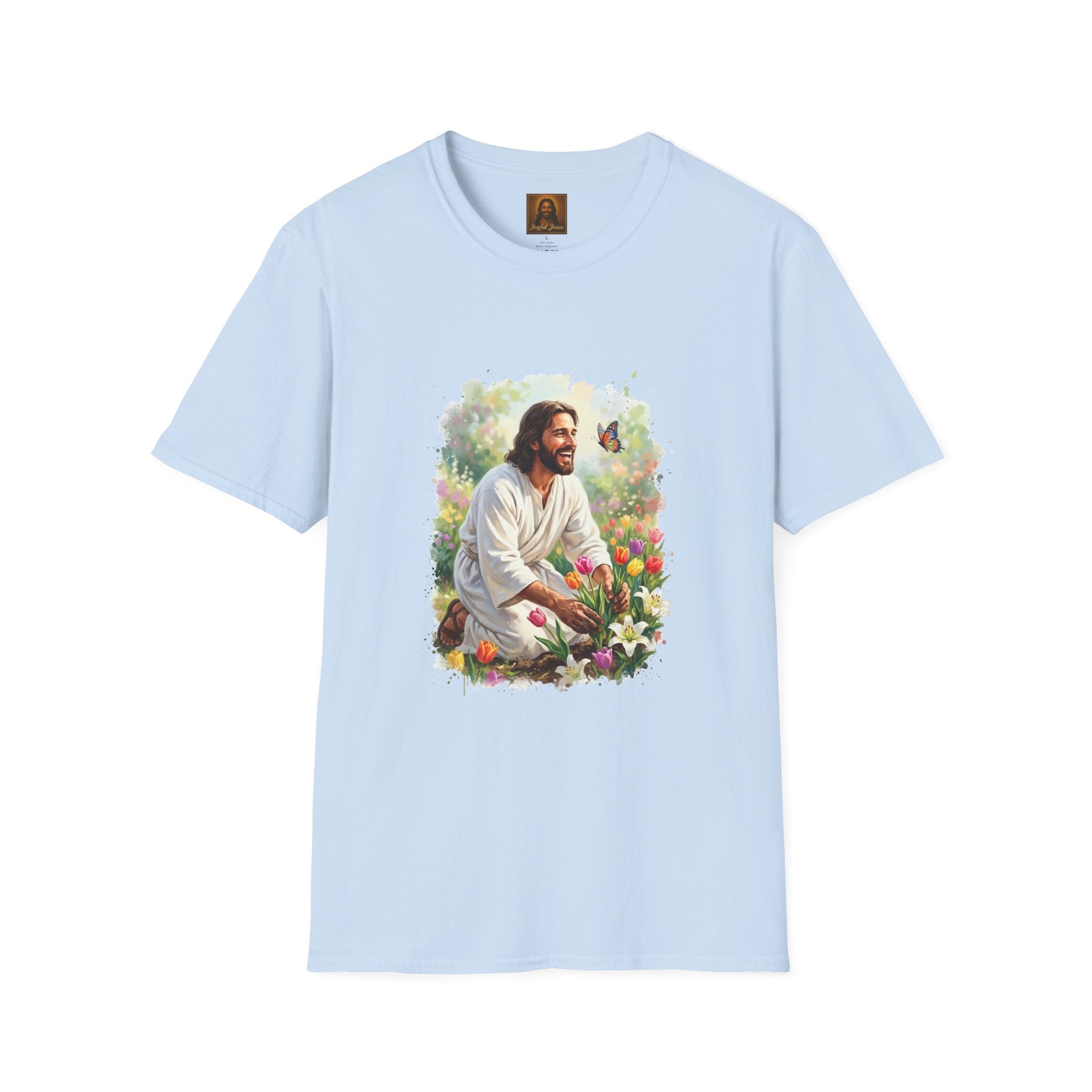 Jesus in the garden — hands in the soil, surrounded by Easter lilies and tulips, laughing as a butterfly lands nearby. Wearable art from Joyful Jesus. Joy is the Way. "She turned around and saw Jesus standing there, but she did not realize that it was Jesus. He asked her, 'Woman, why are you crying? Who is it you are looking for?' Thinking he was the gardener..." — John 20:14-15 She thought he was the gardener. And maybe she wasn't wrong. This original Joyful Jesus design reimagines that beautiful Easter morning moment — Jesus kneeling in a garden overflowing with Easter lilies, tulips, and wildflowers, dirt on his hands, laughing with joy as a monarch butterfly dances beside him. New life everywhere. The resurrection told not through an empty tomb, but through a garden in full bloom. ABOUT THE DESIGN A warm, painterly scene rich with Easter symbolism. Easter lilies for resurrection. Tulips in full spring color. A monarch butterfly — the ultimate symbol of transformation. And Jesus with dirt on his hands, fully present in the act of nurturing new life. Brushstroke-edge framing on a black background makes every color sing. ABOUT JOYFUL JESUS We believe joy is the heart of Jesus' message. Every design celebrates faith through vibrant, art-forward imagery — never preachy, never political, just joy. Joy is the Way. PERFECT FOR - Easter Sunday and spring celebrations - Gardeners and plant lovers who love Jesus - Anyone who connects with the Mary Magdalene garden story - Butterfly and nature lovers of faith - Gifts for moms, grandmas, and women of faith - Spring church services and Bible study groups PRODUCT DETAILS - Premium unisex t-shirt - Print-on-demand (made just for you) - Multiple sizes available (see size chart) - Machine wash cold, tumble dry low - Printed with high-quality, durable inks SHIPPING Free shipping included! Orders are produced and shipped within 2-7 business days. ORDER EARLY FOR EASTER Easter is April 5, 2026. Order by mid-March to ensure delivery in time! Have questions? Message us anytime — we respond quickly! Product features - 100% ring-spun cotton lightweight fabric (4.5 oz/yd²) — soft and breathable - Tubular knit without side seams for a smooth, waste-reducing finish - Ribbed collar with shoulder tape for shape retention and durability - Pearlized tear-away label for itch-free comfort; adult sizing - DTG/DTF print methods used for vivid, long-lasting artwork Care instructions - Do not dryclean - Do not bleach - Tumble dry: low heat - Iron, steam or dry: low heat - Machine wash: cold (max 30C or 90F), with similar colors