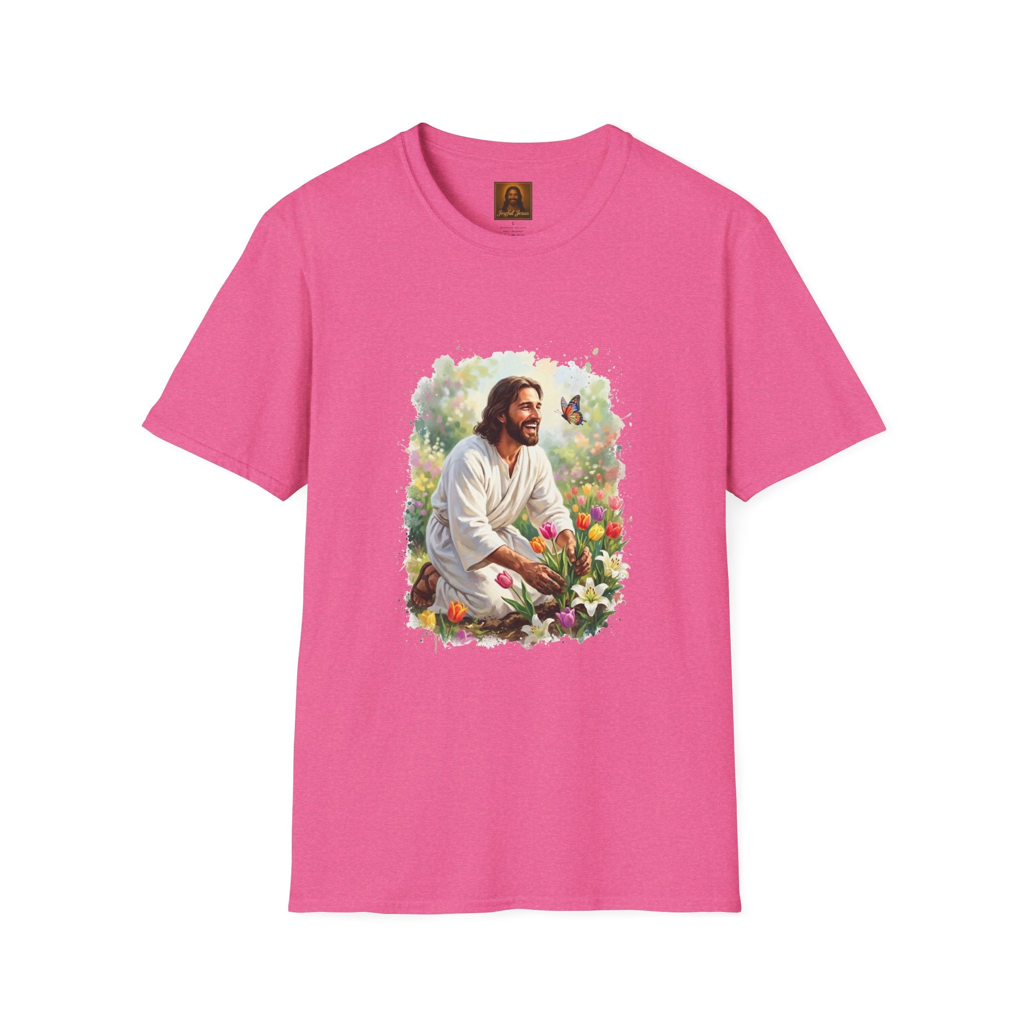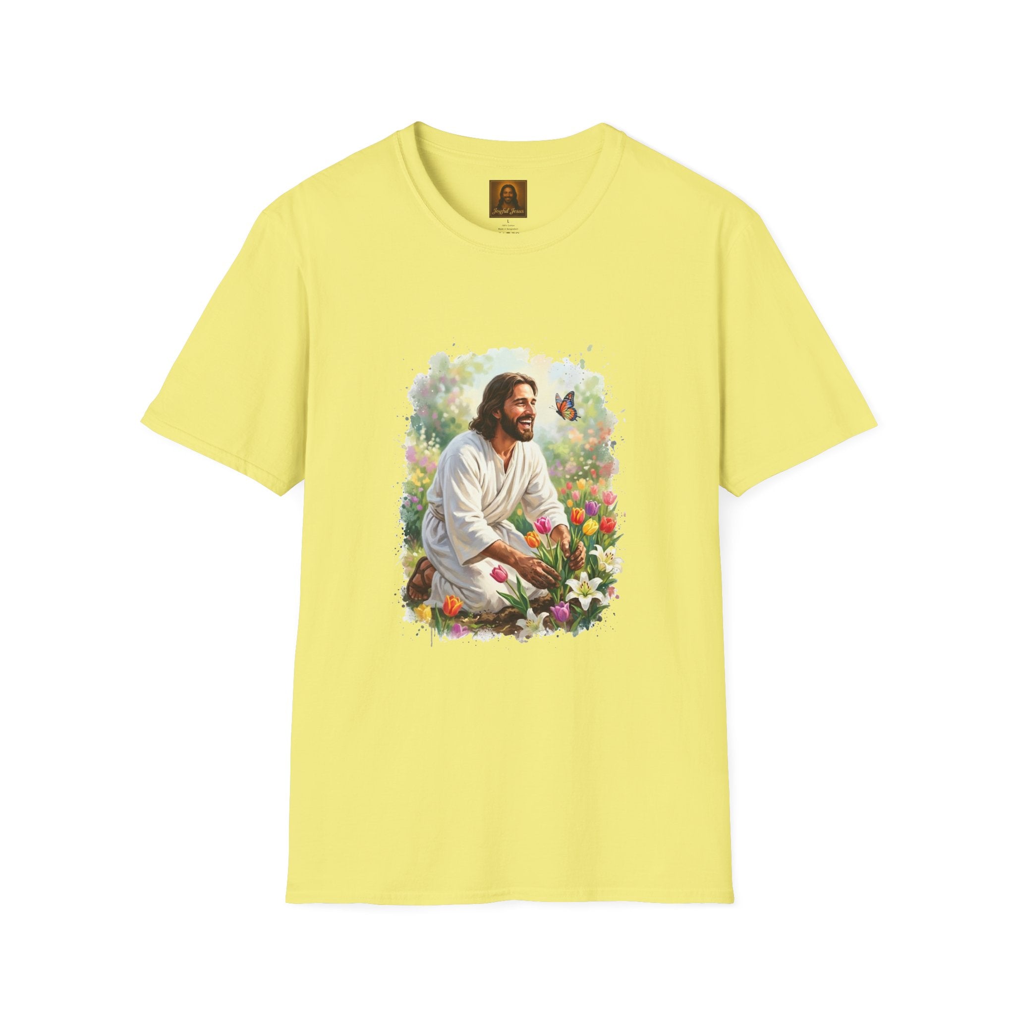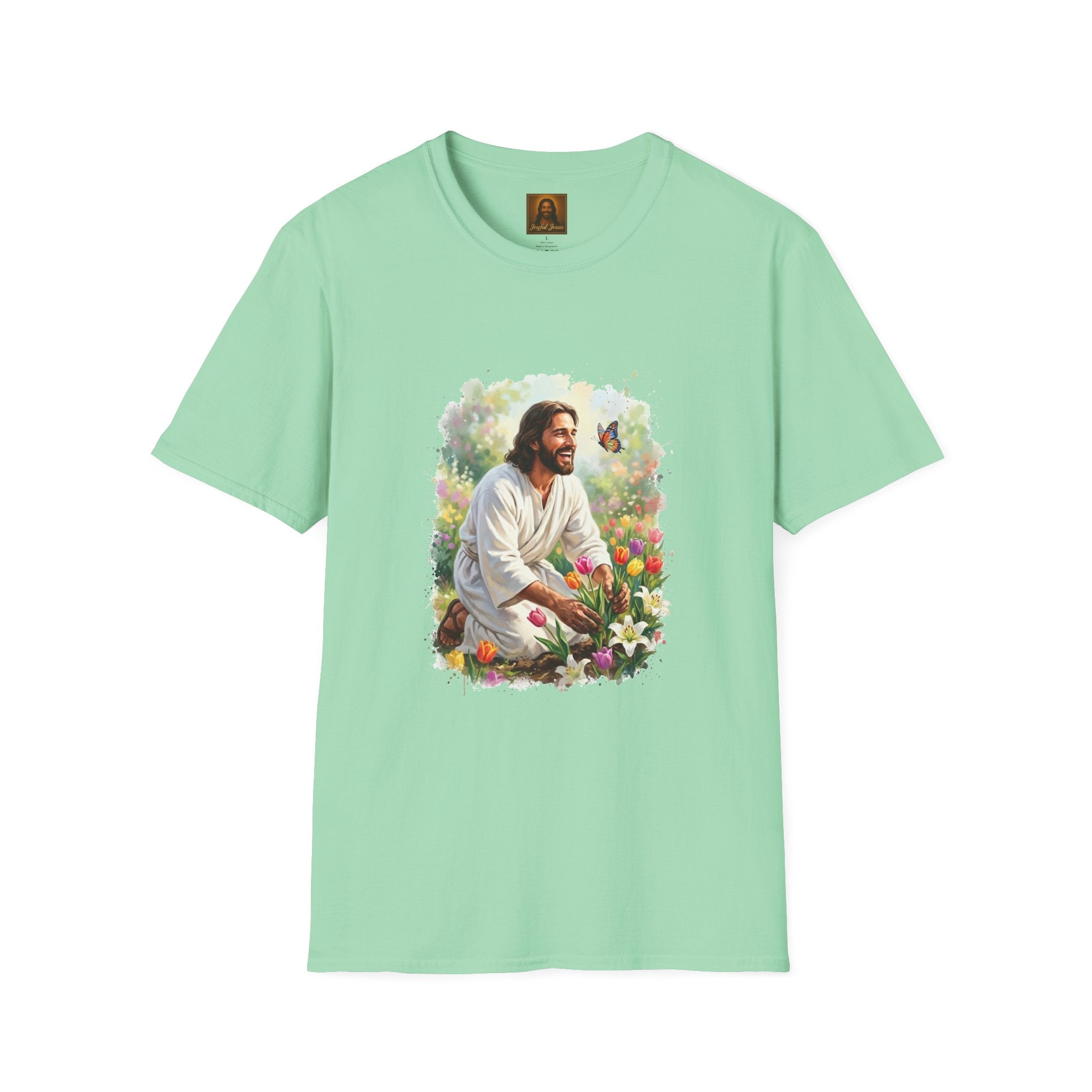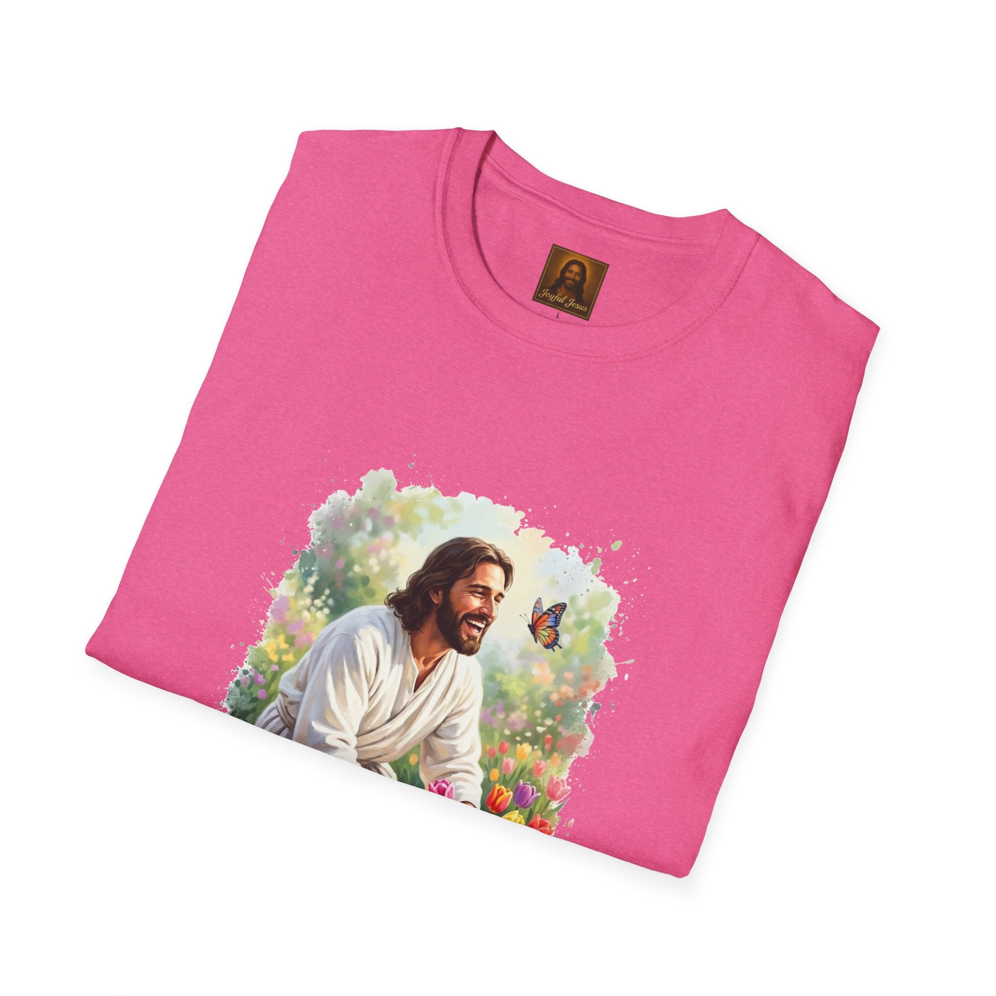 Jesus in the garden — hands in the soil, surrounded by Easter lilies and tulips, laughing as a butterfly lands nearby. Wearable art from Joyful Jesus. Joy is the Way. "She turned around and saw Jesus standing there, but she did not realize that it was Jesus. He asked her, 'Woman, why are you crying? Who is it you are looking for?' Thinking he was the gardener..." — John 20:14-15 She thought he was the gardener. And maybe she wasn't wrong. This original Joyful Jesus design reimagines that beautiful Easter morning moment — Jesus kneeling in a garden overflowing with Easter lilies, tulips, and wildflowers, dirt on his hands, laughing with joy as a monarch butterfly dances beside him. New life everywhere. The resurrection told not through an empty tomb, but through a garden in full bloom. ABOUT THE DESIGN A warm, painterly scene rich with Easter symbolism. Easter lilies for resurrection. Tulips in full spring color. A monarch butterfly — the ultimate symbol of transformation. And Jesus with dirt on his hands, fully present in the act of nurturing new life. Brushstroke-edge framing on a black background makes every color sing. ABOUT JOYFUL JESUS We believe joy is the heart of Jesus' message. Every design celebrates faith through vibrant, art-forward imagery — never preachy, never political, just joy. Joy is the Way. PERFECT FOR - Easter Sunday and spring celebrations - Gardeners and plant lovers who love Jesus - Anyone who connects with the Mary Magdalene garden story - Butterfly and nature lovers of faith - Gifts for moms, grandmas, and women of faith - Spring church services and Bible study groups PRODUCT DETAILS - Premium unisex t-shirt - Print-on-demand (made just for you) - Multiple sizes available (see size chart) - Machine wash cold, tumble dry low - Printed with high-quality, durable inks SHIPPING Free shipping included! Orders are produced and shipped within 2-7 business days. ORDER EARLY FOR EASTER Easter is April 5, 2026. Order by mid-March to ensure delivery in time! Have questions? Message us anytime — we respond quickly! Product features - 100% ring-spun cotton lightweight fabric (4.5 oz/yd²) — soft and breathable - Tubular knit without side seams for a smooth, waste-reducing finish - Ribbed collar with shoulder tape for shape retention and durability - Pearlized tear-away label for itch-free comfort; adult sizing - DTG/DTF print methods used for vivid, long-lasting artwork Care instructions - Do not dryclean - Do not bleach - Tumble dry: low heat - Iron, steam or dry: low heat - Machine wash: cold (max 30C or 90F), with similar colors