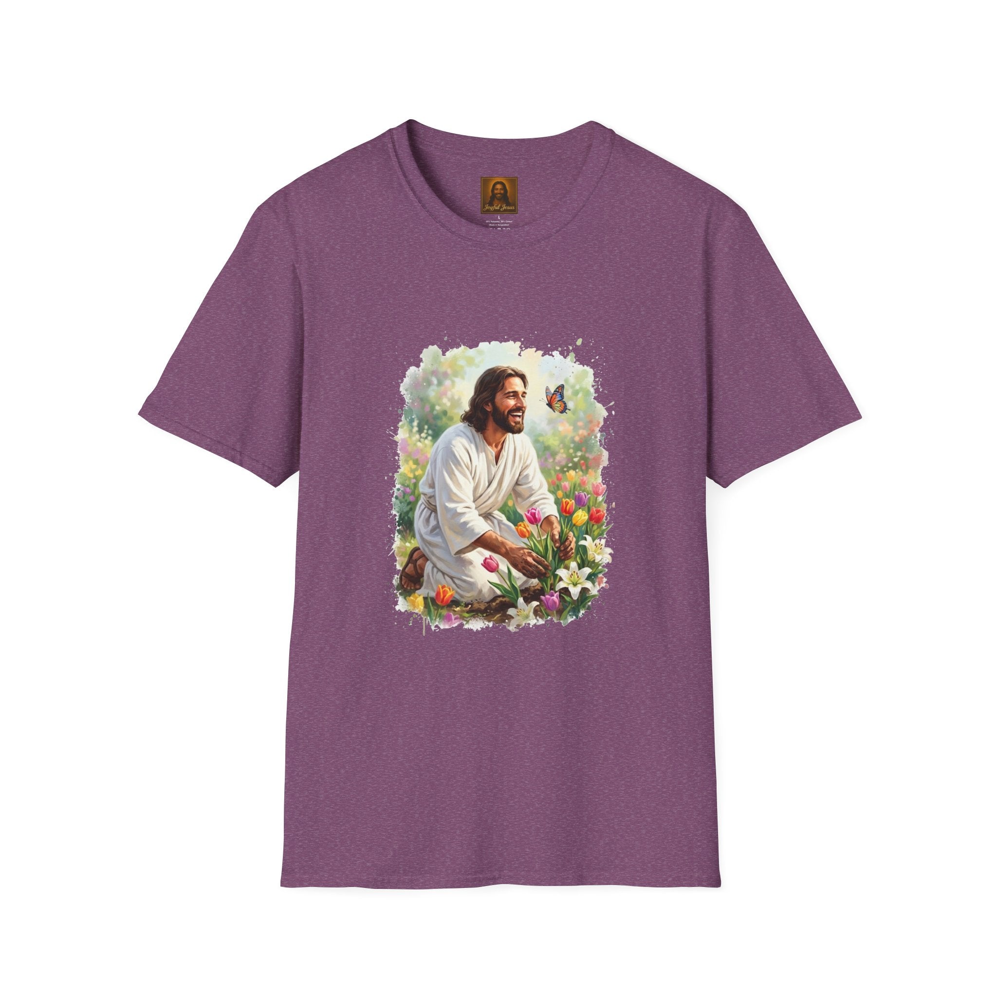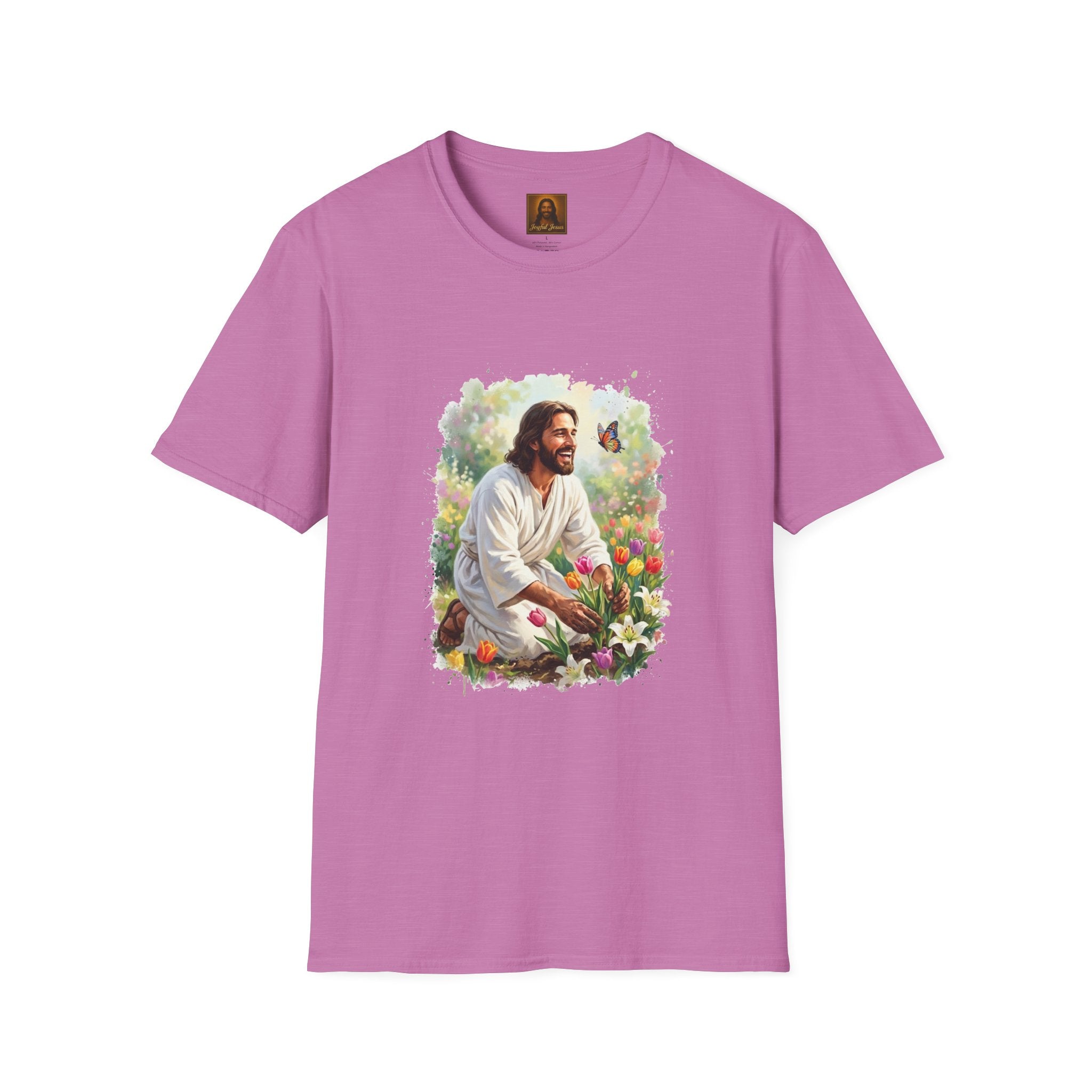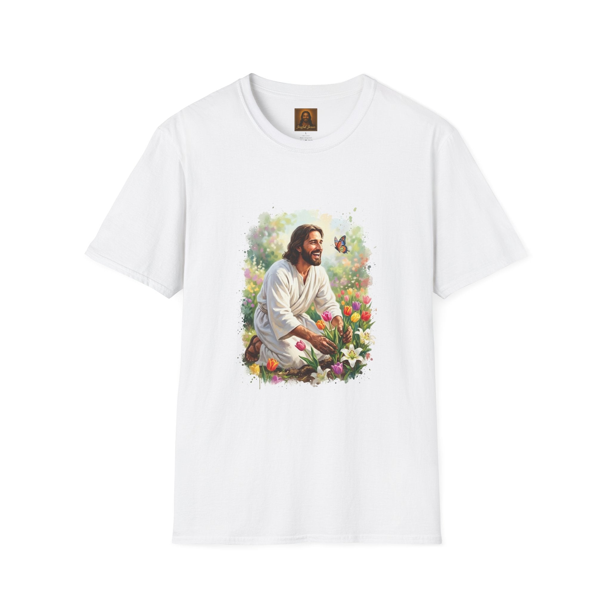 Jesus in the Garden Shirt, Easter Lily Butterfly Art, Christian Spring Tee