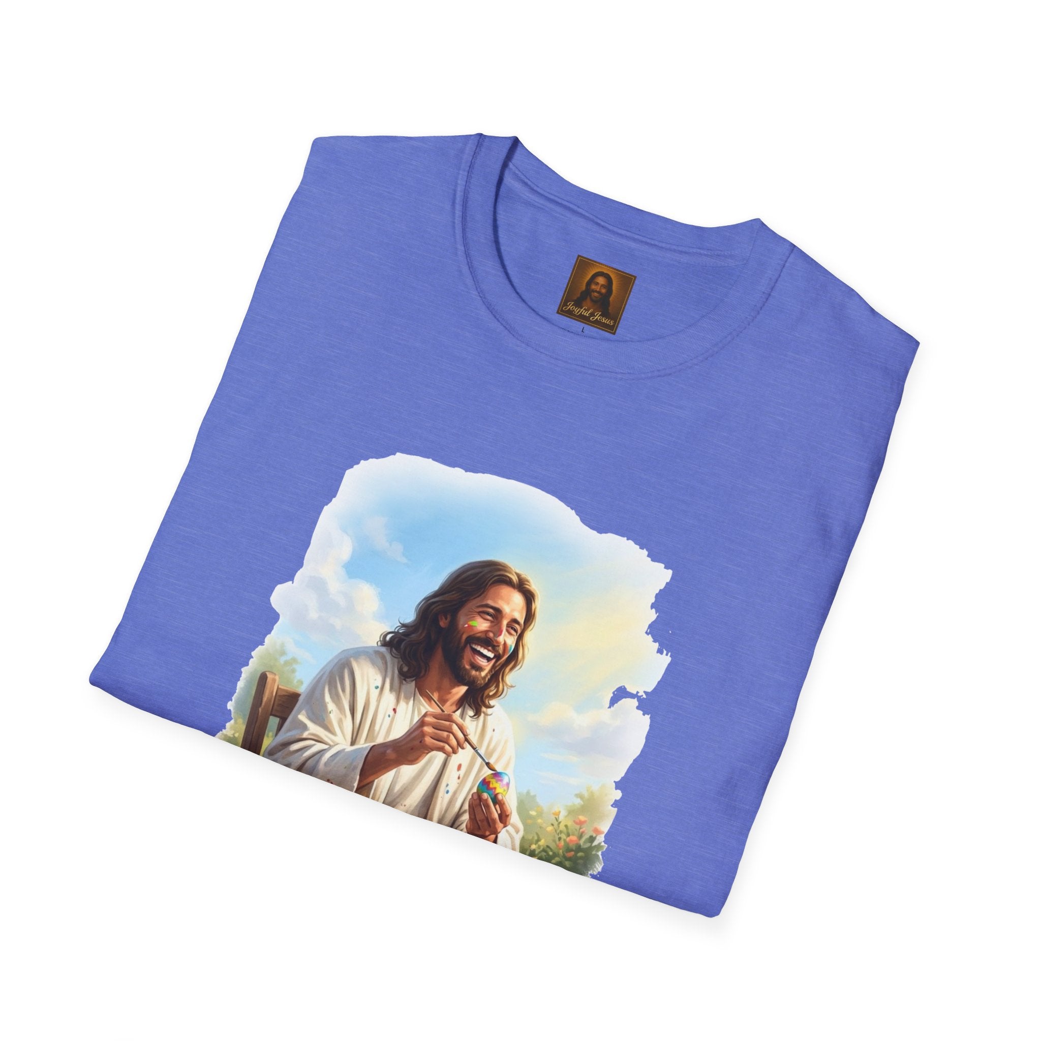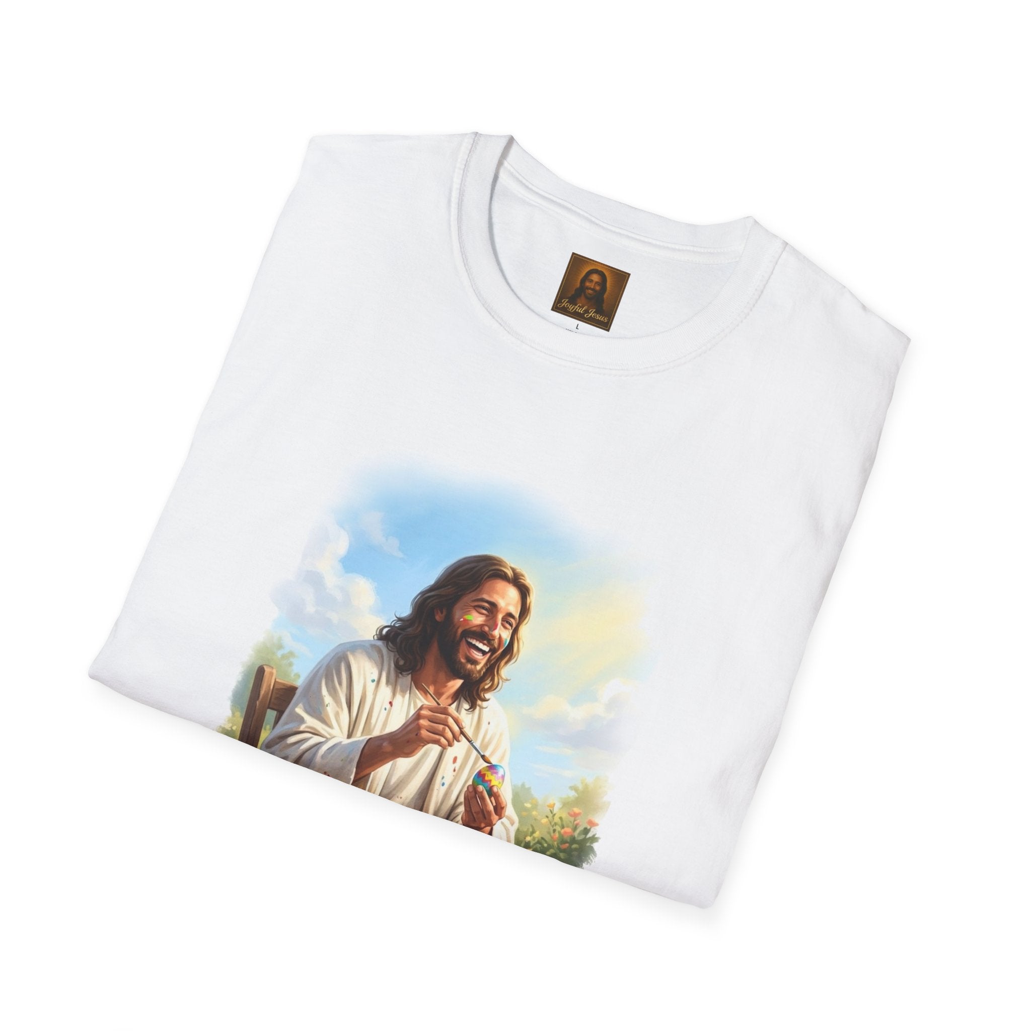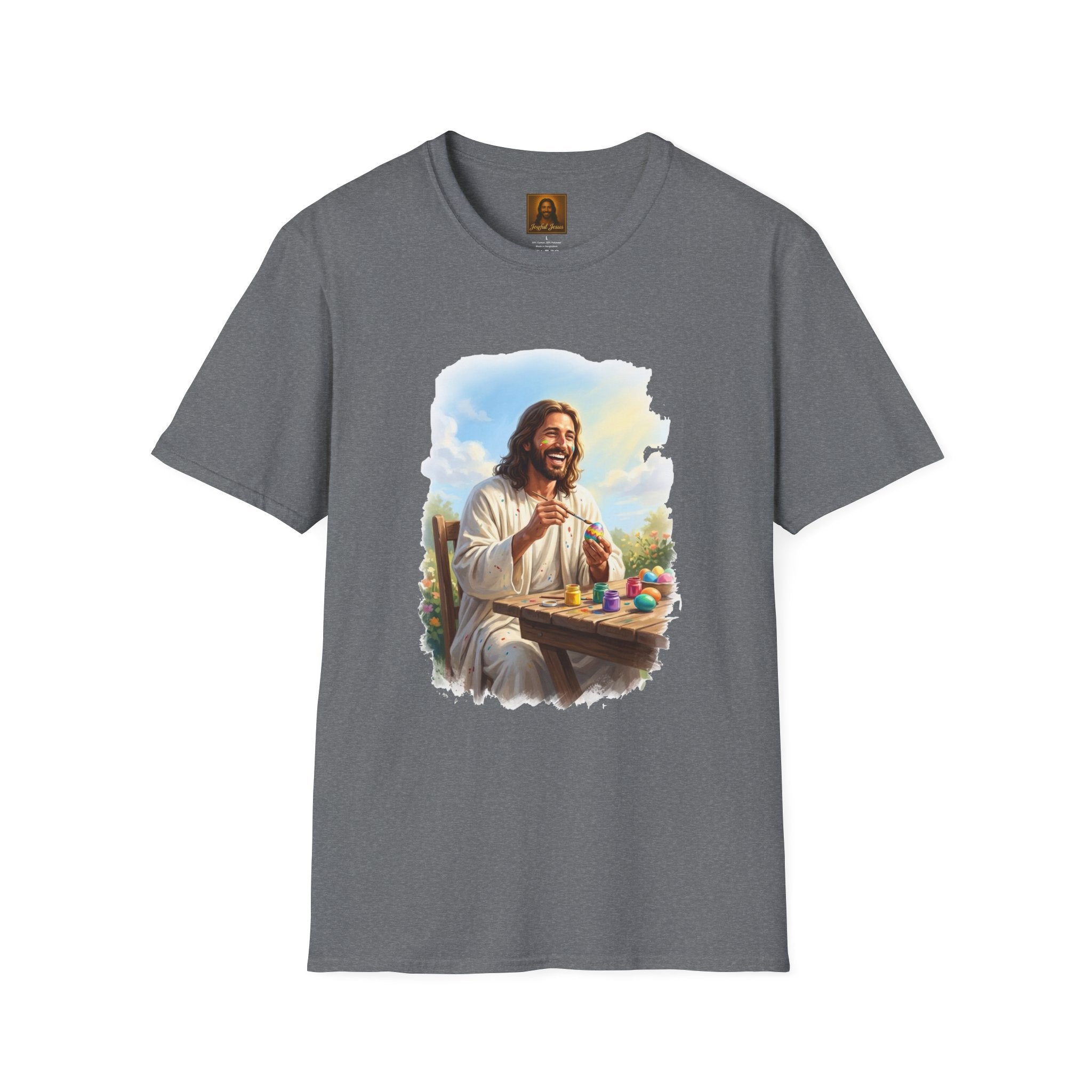 Jesus painting Easter eggs — covered in paint, laughing, fully in the moment. Whatever you do, do it with joy. Wearable art from Joyful Jesus. Joy is the Way. Jesus painting Easter eggs — covered in paint splatters, brush in hand, laughing like he's having the best afternoon of his life. Because whatever you do, do it with the joy of Jesus. That's the whole idea behind Joyful Jesus. It's not about what you're doing — it's about how much joy you bring to it. Even painting eggs at a wooden table in the garden becomes something sacred when you're fully present and loving every second. ABOUT THE DESIGN This original Joyful Jesus artwork captures Jesus sitting at a rustic table outdoors, surrounded by colorful paint jars and finished eggs, brush in hand, paint splattered across his robes and even on his face. The garden is blooming behind him, the sun is shining, and he's absolutely in his element. Warm, painterly brushstroke-edge framing on a black background. ABOUT JOYFUL JESUS We believe joy is the heart of Jesus' message. Every design celebrates faith through vibrant, art-forward imagery — never preachy, never political, just joy. Joy is the Way. PERFECT FOR - Easter Sunday and spring celebrations - Crafters, artists, and creative people who love Jesus - Family Easter egg painting traditions - Gifts for moms, teachers, and Sunday school leaders - Anyone who believes joy is a spiritual practice PRODUCT DETAILS - Premium unisex t-shirt - Print-on-demand (made just for you) - Multiple sizes available (see size chart) - Machine wash cold, tumble dry low - Printed with high-quality, durable inks SHIPPING Free shipping included! Orders are produced and shipped within 2-7 business days. ORDER EARLY FOR EASTER Easter is April 5, 2026. Order by mid-March to ensure delivery in time! Have questions? Message us anytime — we respond quickly! Product features - 100% ring-spun cotton for a soft, lightweight feel (varies for heathers) - Tubular knit construction — no side seams for a clean look - Ribbed collar with shoulder tape for shape retention - Pearlized tear-away label for comfort - DTG/DTF-printed artwork for vivid, durable imagery Care instructions - Do not dryclean - Do not bleach - Tumble dry: low heat - Iron, steam or dry: low heat - Machine wash: cold (max 30C or 90F), with similar colors