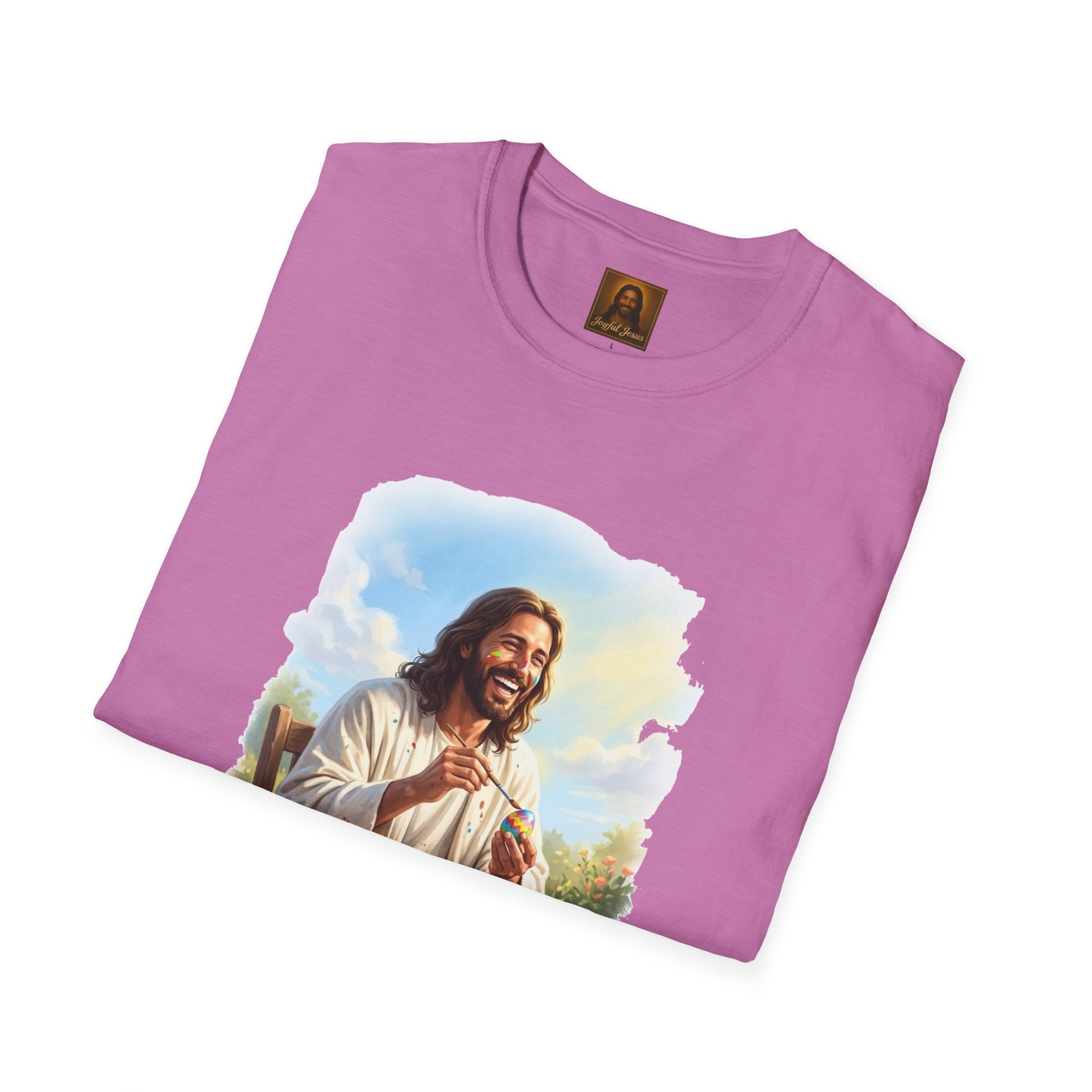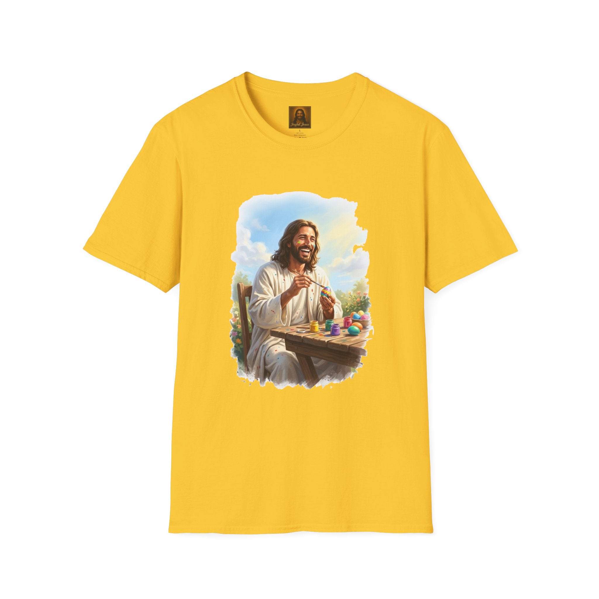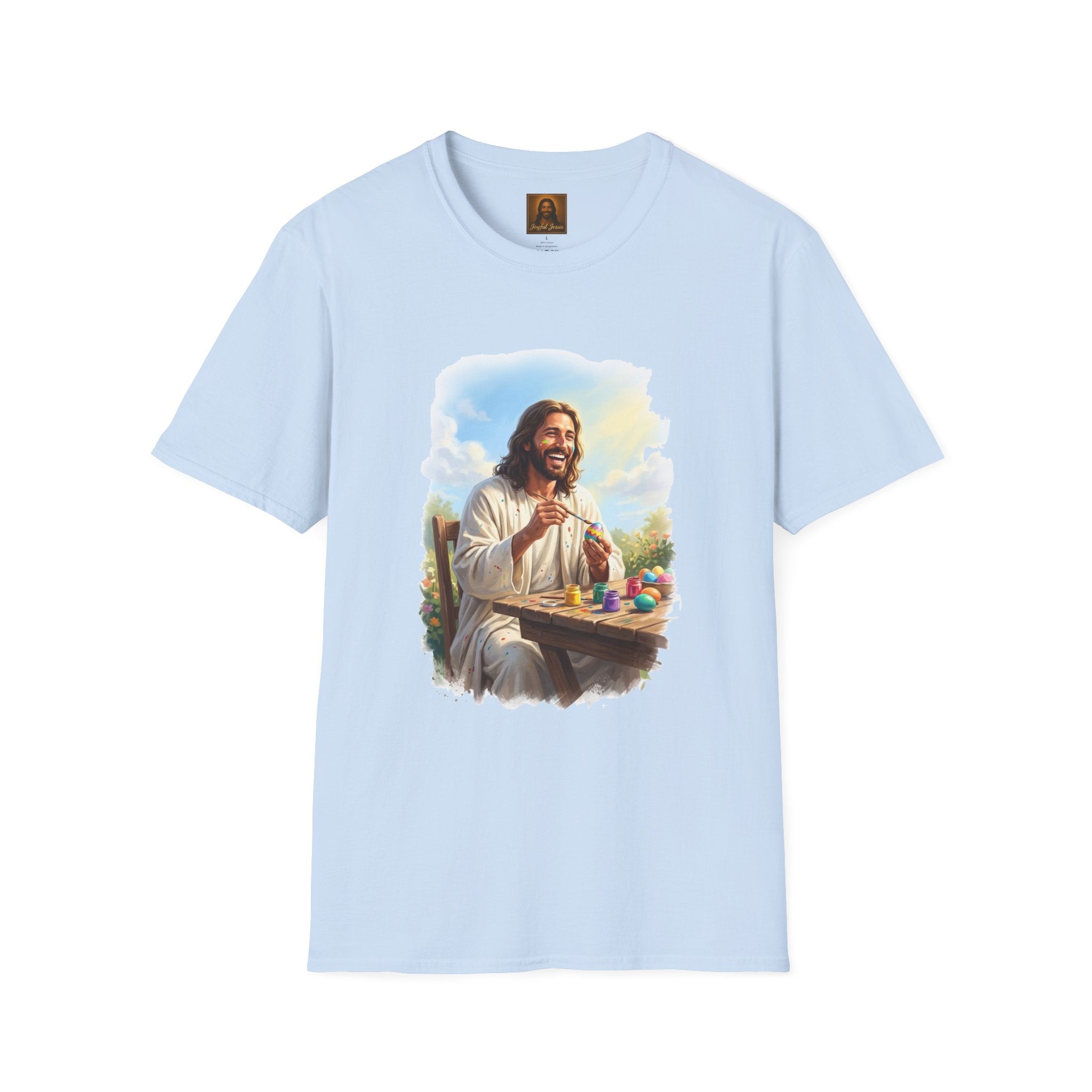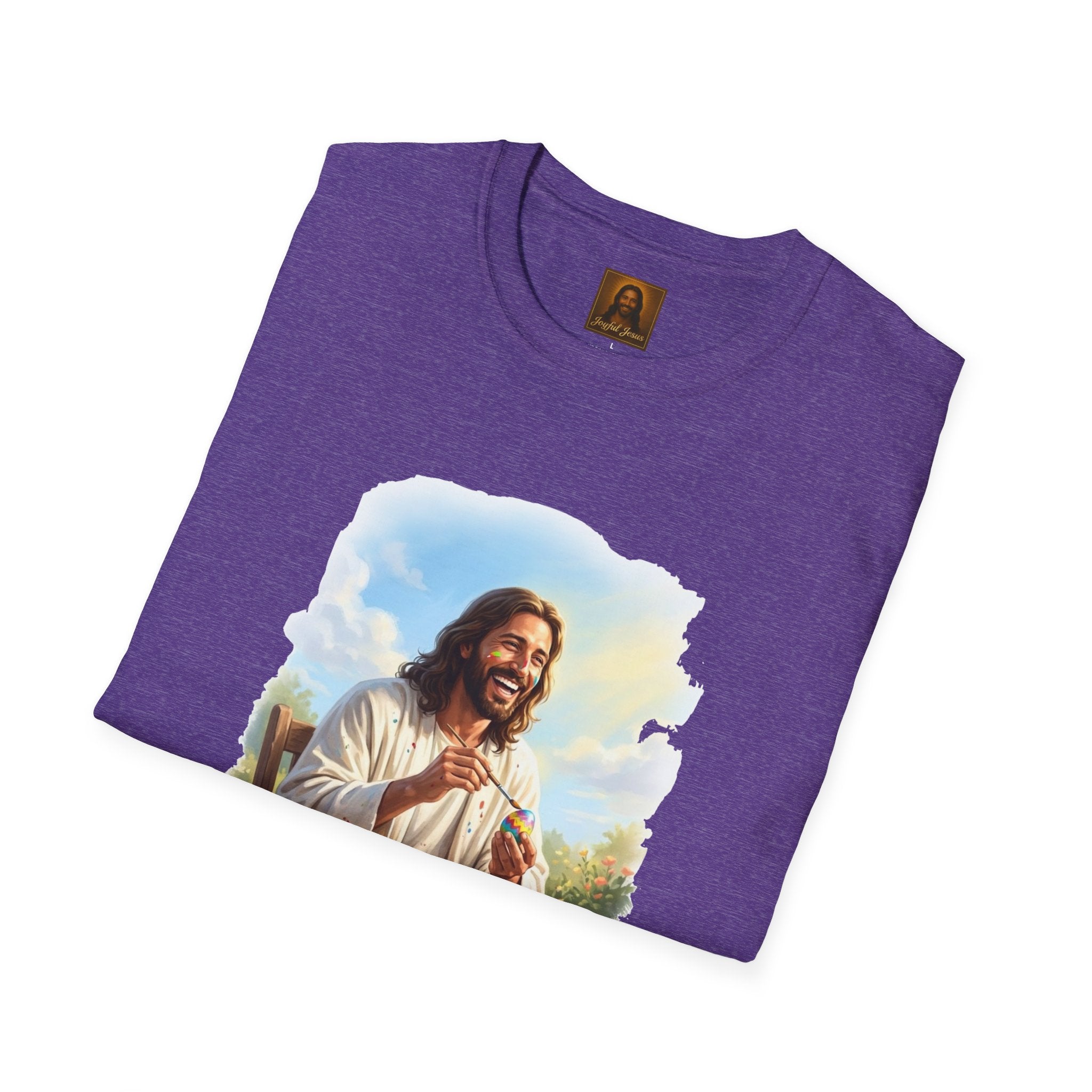 Jesus painting Easter eggs — covered in paint, laughing, fully in the moment. Whatever you do, do it with joy. Wearable art from Joyful Jesus. Joy is the Way. Jesus painting Easter eggs — covered in paint splatters, brush in hand, laughing like he's having the best afternoon of his life. Because whatever you do, do it with the joy of Jesus. That's the whole idea behind Joyful Jesus. It's not about what you're doing — it's about how much joy you bring to it. Even painting eggs at a wooden table in the garden becomes something sacred when you're fully present and loving every second. ABOUT THE DESIGN This original Joyful Jesus artwork captures Jesus sitting at a rustic table outdoors, surrounded by colorful paint jars and finished eggs, brush in hand, paint splattered across his robes and even on his face. The garden is blooming behind him, the sun is shining, and he's absolutely in his element. Warm, painterly brushstroke-edge framing on a black background. ABOUT JOYFUL JESUS We believe joy is the heart of Jesus' message. Every design celebrates faith through vibrant, art-forward imagery — never preachy, never political, just joy. Joy is the Way. PERFECT FOR - Easter Sunday and spring celebrations - Crafters, artists, and creative people who love Jesus - Family Easter egg painting traditions - Gifts for moms, teachers, and Sunday school leaders - Anyone who believes joy is a spiritual practice PRODUCT DETAILS - Premium unisex t-shirt - Print-on-demand (made just for you) - Multiple sizes available (see size chart) - Machine wash cold, tumble dry low - Printed with high-quality, durable inks SHIPPING Free shipping included! Orders are produced and shipped within 2-7 business days. ORDER EARLY FOR EASTER Easter is April 5, 2026. Order by mid-March to ensure delivery in time! Have questions? Message us anytime — we respond quickly! Product features - 100% ring-spun cotton for a soft, lightweight feel (varies for heathers) - Tubular knit construction — no side seams for a clean look - Ribbed collar with shoulder tape for shape retention - Pearlized tear-away label for comfort - DTG/DTF-printed artwork for vivid, durable imagery Care instructions - Do not dryclean - Do not bleach - Tumble dry: low heat - Iron, steam or dry: low heat - Machine wash: cold (max 30C or 90F), with similar colors