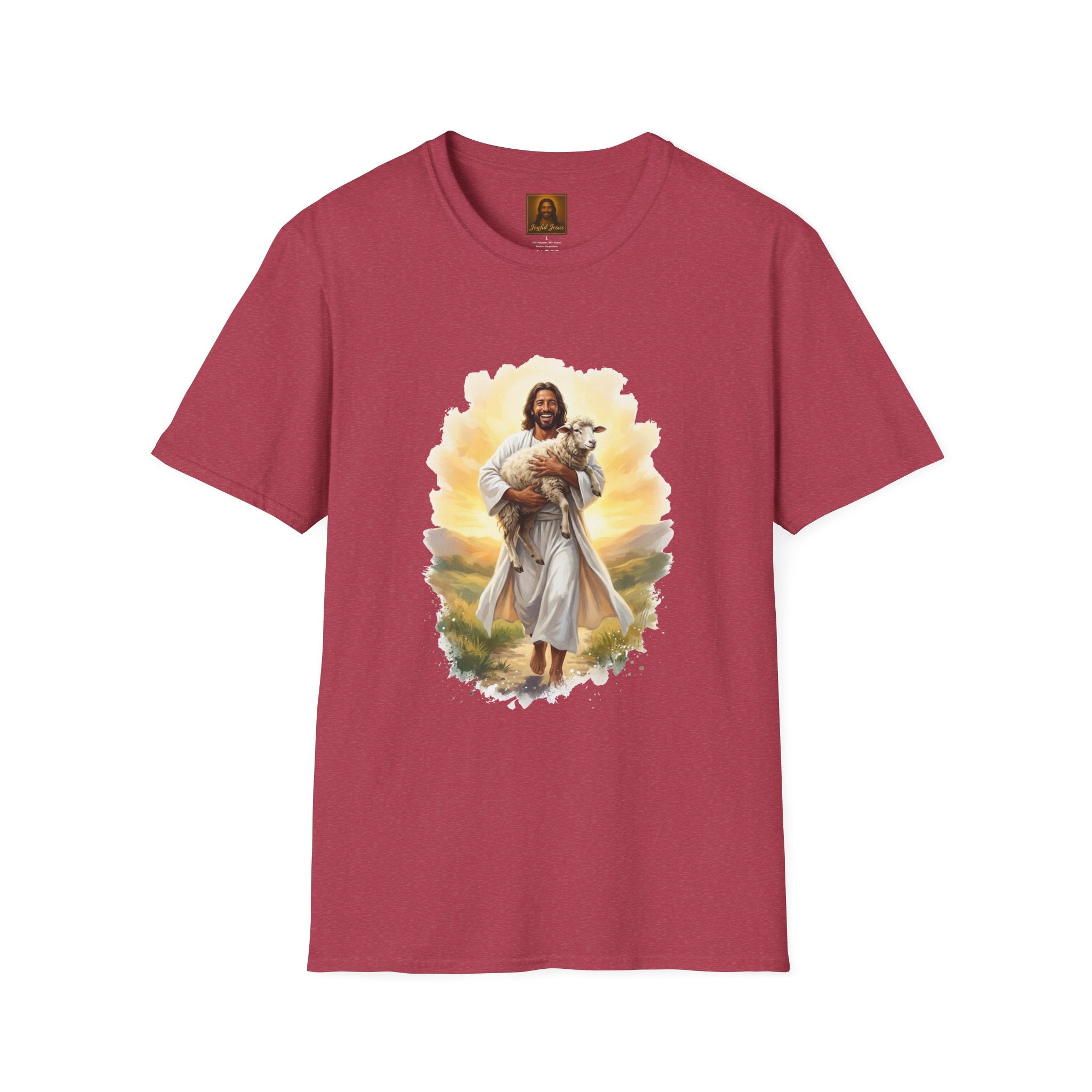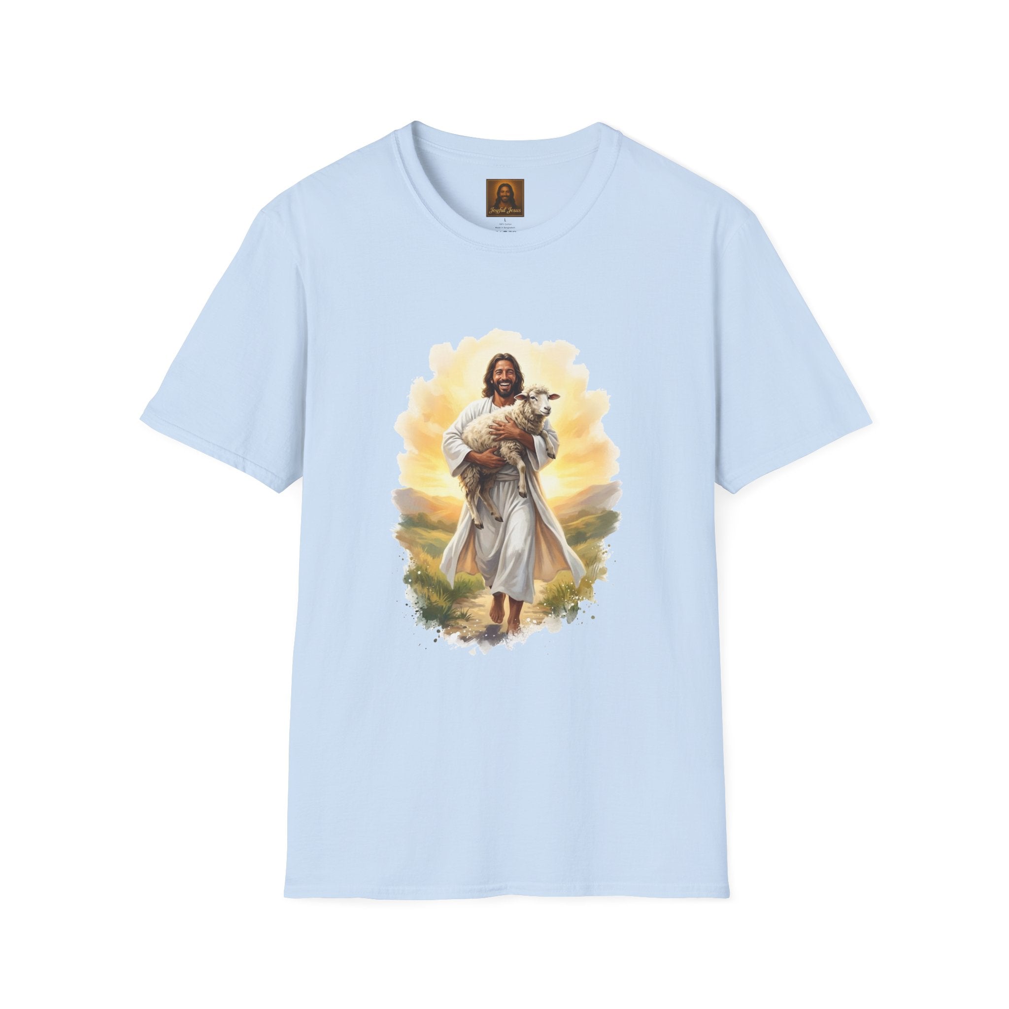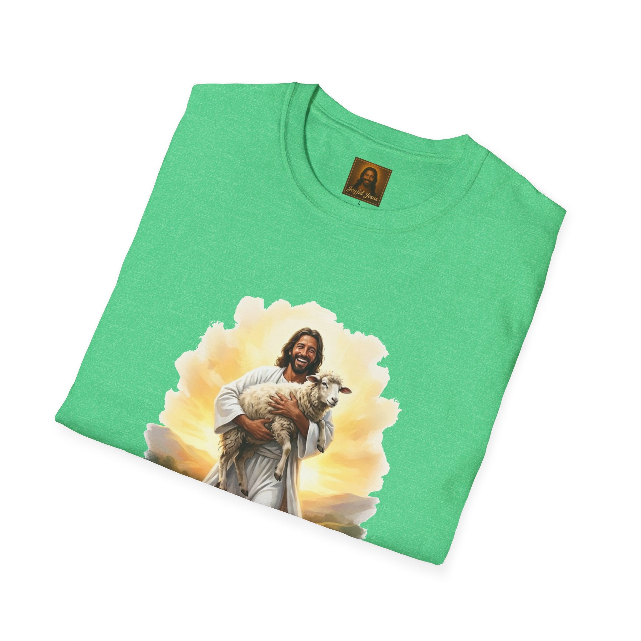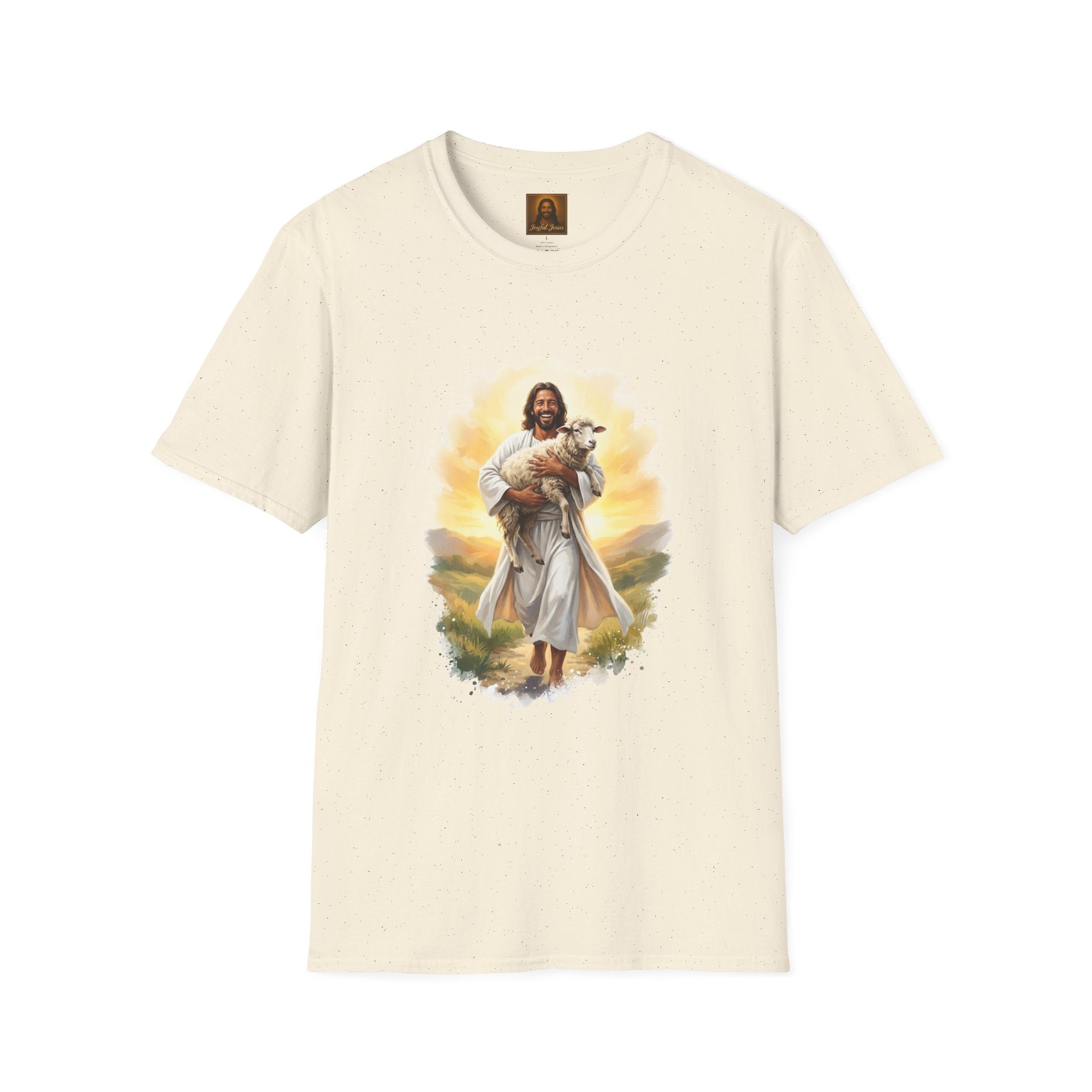 The Lost Sheep — Jesus laughing with pure joy as he carries his found lamb home. Wearable parable art from Joyful Jesus. Joy is the Way. The Lost Sheep — Jesus beaming with pure joy as he cradles his found lamb, walking through golden-lit hills. This original Joyful Jesus artwork brings one of the most beloved parables to life — not with solemnity, but with the overwhelming happiness of finding what was lost. "What man of you, having a hundred sheep, if he has lost one of them, does not leave the ninety-nine and go after the one that is lost, until he finds it? And when he has found it, he lays it on his shoulders, rejoicing." — Luke 15:4-5 ABOUT THE DESIGN This warm, painterly artwork captures the moment of reunion — Jesus striding joyfully through rolling green hills at golden hour, cradling his sheep with the biggest smile you've ever seen. Brushstroke-edge framing on a black background makes the art pop on any shirt color. ABOUT JOYFUL JESUS We believe joy is the heart of Jesus' message. Every design celebrates faith through vibrant, art-forward imagery — never preachy, never political, just joy. Joy is the Way. PERFECT FOR - Easter Sunday and Resurrection celebrations - Anyone who loves the Good Shepherd parable - Sheep and farm animal lovers who also love Jesus - Gifts for pastors, youth leaders, and Bible study groups - Everyday faith wear that starts conversations PRODUCT DETAILS - Premium unisex t-shirt - Print-on-demand (made just for you) - Multiple sizes available (see size chart) - Machine wash cold, tumble dry low - Printed with high-quality, durable inks SHIPPING Free shipping included! Orders are produced and shipped within 2-7 business days. ORDER EARLY FOR EASTER Easter is April 5, 2026. Order by mid-March to ensure delivery in time! Have questions? Message us anytime — we respond quickly! Product features - 100% ring-spun cotton (lightweight 153 g/m²) for soft, year-round comfort - Tubular knit construction with no side seams for cleaner drape and reduced fabric waste - Ribbed knit collar and shoulder tape to maintain shape and prevent stretching - DTG and DTF print methods used for vibrant, durable artwork (sleeve/neck labels printed by DTF) - Pearlized tear-away label, Oeko-Tex certification, EU 2-year warranty Care instructions - Do not dryclean - Do not bleach - Tumble dry: low heat - Iron, steam or dry: low heat - Machine wash: cold (max 30C or 90F), with similar colors