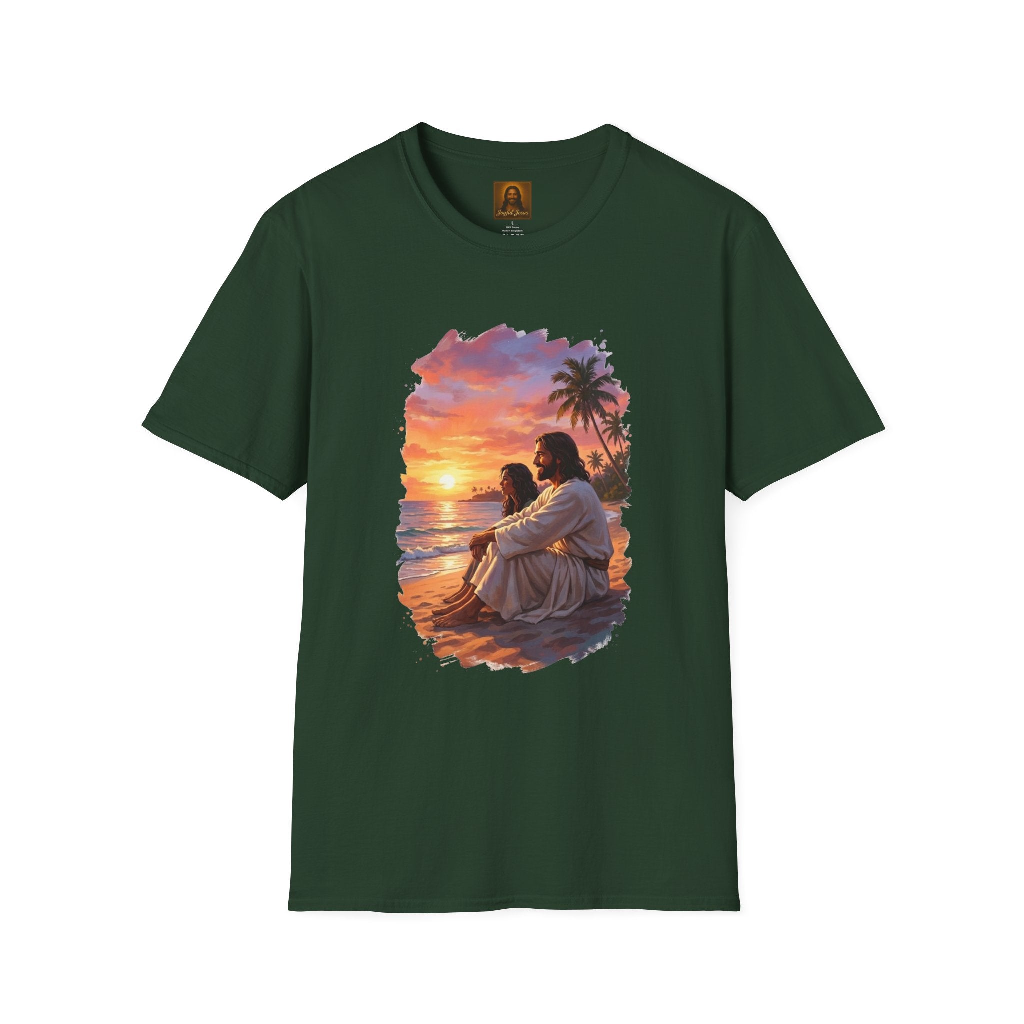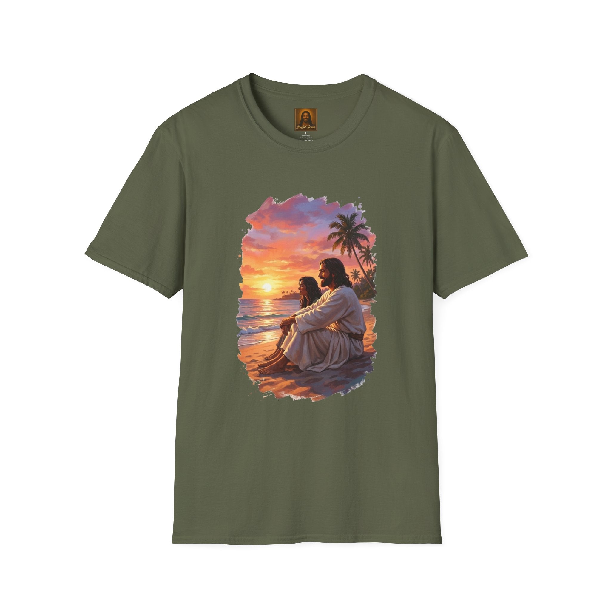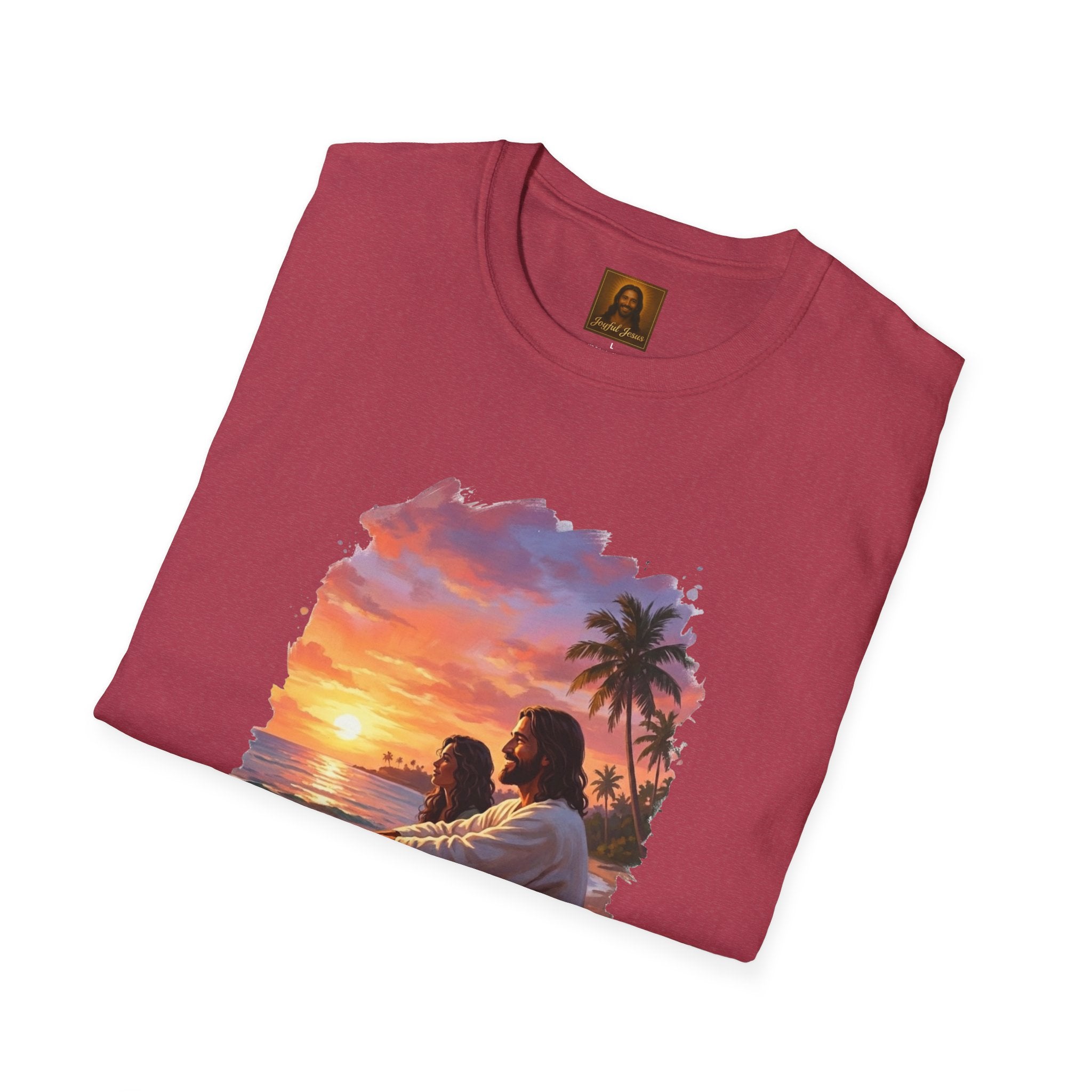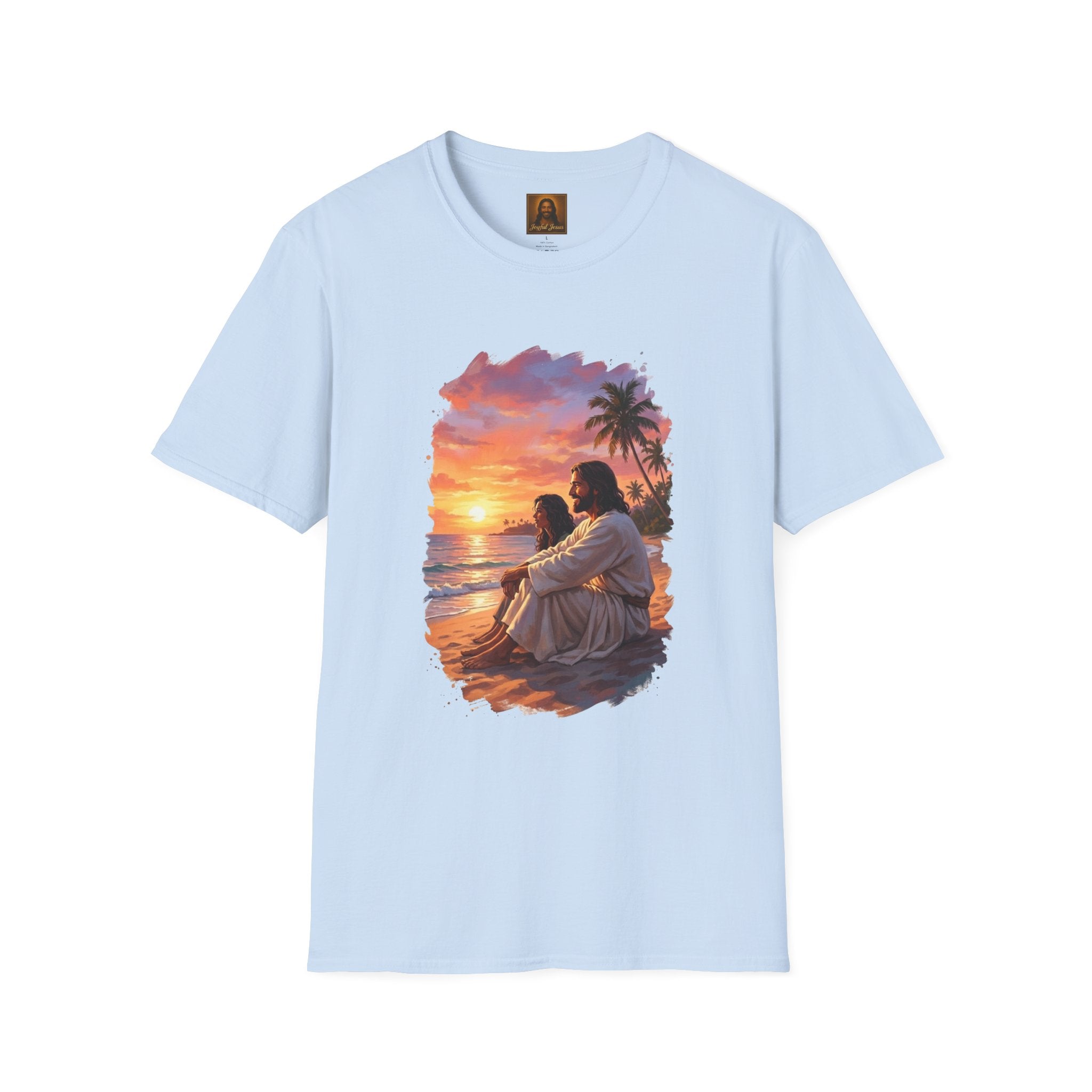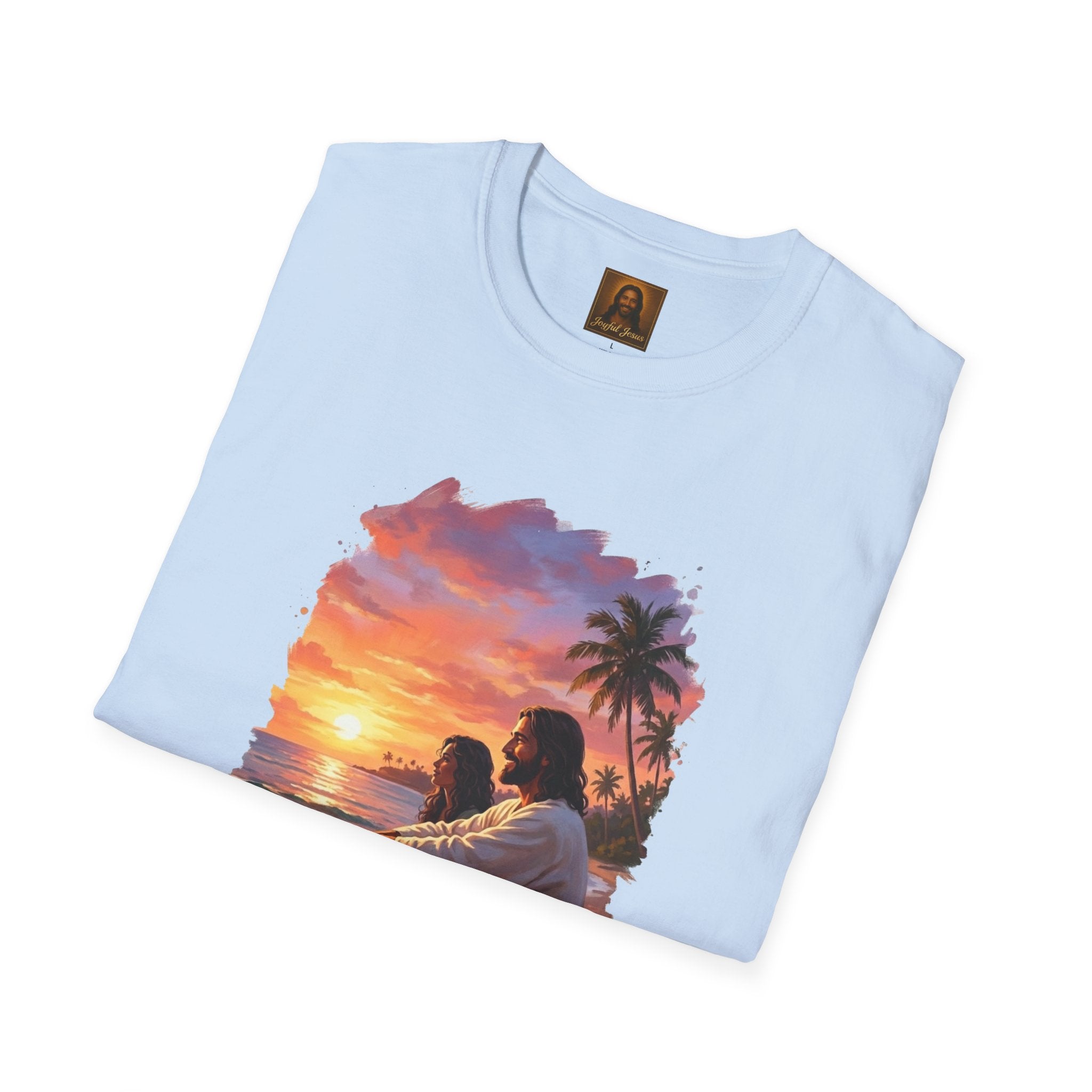 Jesus sitting in the sand next to the water with a woman at sunset. Palm trees. A beautiful sky.Reflective and happy. The kind of moment that does not need words. A religious shirt for theones who understand that presence is enough.Printed on premium soft cotton. True to size. This Jesus shirt is built to be worn, not shelved.Joyful Jesus faith apparel for quiet moments and golden light.Designed by Joyful Jesus. Presence is enough.Product features- 100% ring-spun cotton (lightweight 153 g/m²) for soft, year-round wear- Tubular knit construction—no side seams for a smooth, clean look- Ribbed knit collar with shoulder tape to preserve shape and prevent stretching- Pearlized tear-away label for itch-free comfort; adult sizing- DTG/DTF printed artwork with vivid colors and durable print qualityCare instructions- Do not dryclean- Do not bleach- Tumble dry: low heat- Iron, steam or dry: low heat- Machine wash: cold (max 30C or 90F), with similar colors